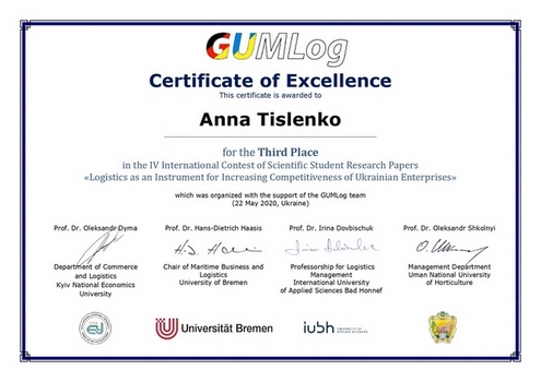 22 травня 2020 року відбувся ІV Міжнародний конкурс студентських наукових робіт «Логістика як інструмент підвищення конкурентоспроможності українських підприємств» (ІV International Contest of Scientific Student Research Papers «Logistics as an instrument for increasing competitiveness of Ukrainian enterprises»), що був організований Університетом м. Бремен (Німеччина), Київським національним економічним університетом ім. Вадима Гетьмана, Уманським національним університетом садівництва.