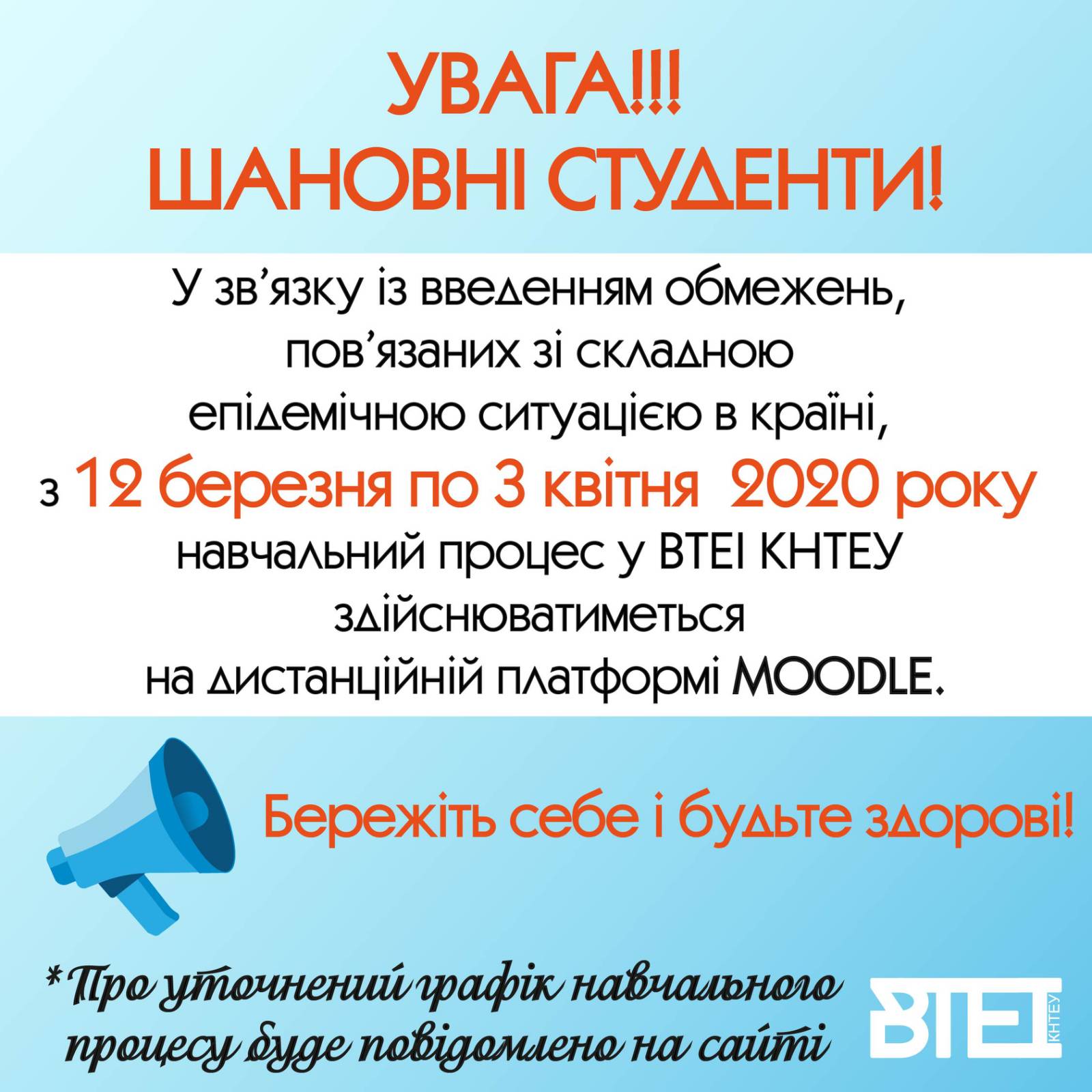 У зв’язку із введенням обмежень, пов’язаних зі складною епідемічною ситуацією в країні, з 12 березня по 03 квітня 2020 року навчальний процес у ВТЕІ КНТЕУ здійснюватиметься на дистанційній платформі MOODLE.