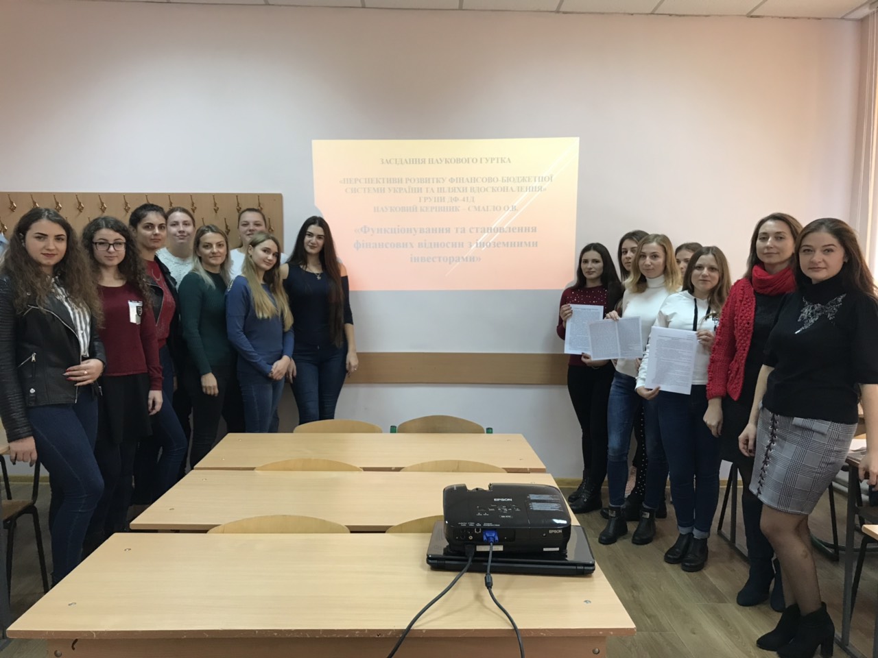 10 жовтня 2019 року відбулося планове засідання наукового гуртка «Перспективи розвитку фінансово-бюджетної системи України та шляхи вдосконалення». Засідання на тему «Функціонування та становлення фінансових відносин з іноземними інвесторами» відкрила керівник наукового гуртка к.е.н., доцент кафедри фінансів Смагло О. В. З цікавими доповідями і презентаціями виступили члени наукового гуртка – здобувачі освітнього ступеня «бакалавр» спеціальності «Фінанси, банківська справа та страхування» групи ДФ-41д.