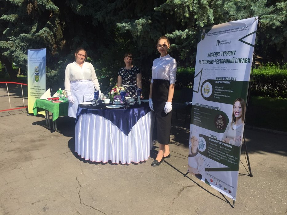 11 червня 2019 року здобувачі вищої освіти спеціальності «Готельно-ресторанна справа» Симоненко А.О. та Галицька І.В. на чолі з асистентом кафедри туризму та готельно-ресторанної справи Пахомською О. В. взяли участь у профорієнтаційному заході «Подорож у світ професій», організованому Вінницьким міським центром зайнятості для учнів 1-7 класів, учасників літніх пришкільних таборів міста. Студенти продемонстрували усім охочим зразки сервірування банкетного столу, провели майстер-клас по складанню серветок. Учні з радістю долучилися до заходу, завзято ставили питання щодо сервірування столу, підбору столових приборів та скляного посуду.