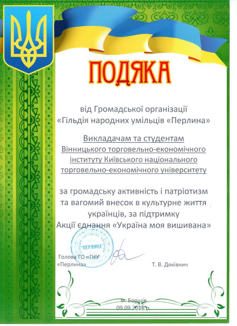 12 листопада 2018 року викладачі та студенти отримали подяку від Громадської організації «Гільдія народних умільців» за підтримку Акції єднання «Україна моя вишивана».