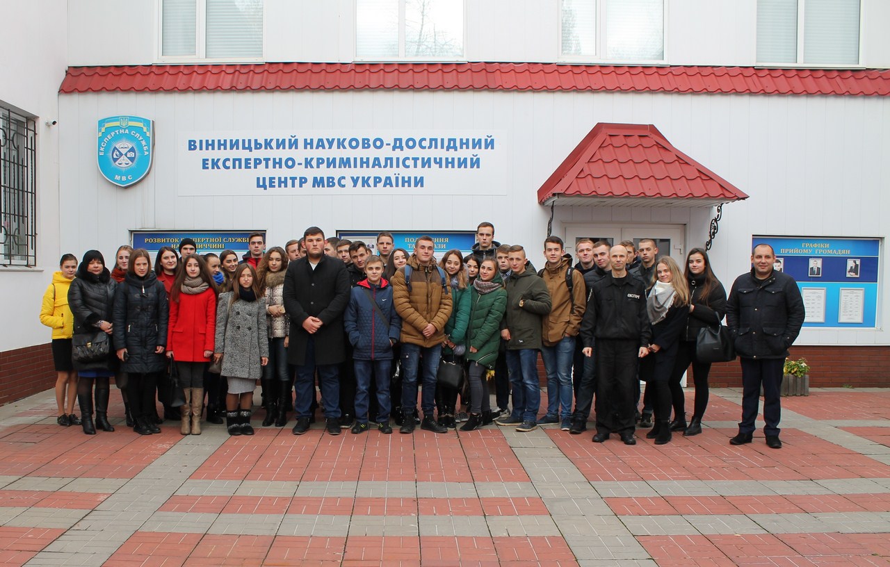 06 листопада 2017 року в рамках проведення тижня факультету економіки, менеджменту та права була організована та проведена екскурсія зі здобувачами вищої освіти навчальних груп 1-го курсу спеціалізації «Фінансове право» та «Комерційне право» до Вінницького науково-дослідного експертно-криміналістичного центру МВС України. Заступник завідувача відділу криміналістичних видів досліджень Неприлюк Р.Г. ознайомив здобувачів з роботою, секторів дактилоскопічних досліджень, техніко-експертного дослідження документів, балістичного, спеціальних досліджень наркотичних засобів та дослідження зразків ДНК.