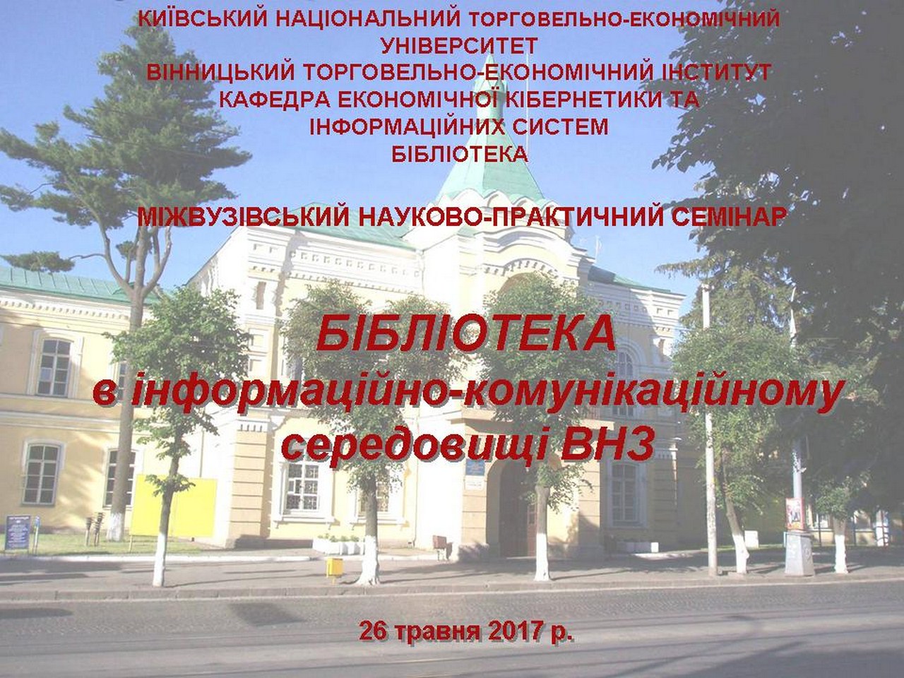 26 травня 2017 року в рамках заходів з нагоди відзначення Дня науки в Україні відбувся Міжвузівський науково-практичний семінар «Бібліотека в інформаційно-комунікаційному середовищі ВНЗ». У роботі семінару прийняли участь викладачі кафедри економічної кібернетики та інформаційних систем, працівники бібліотеки інституту, здобувачі вищої освіти спеціальності «Економічна кібернетика», а також заступник директора наукової бібліотеки Вінницького державного педагогічного університету імені Михайла Коцюбинського Л.М. Воробйова.