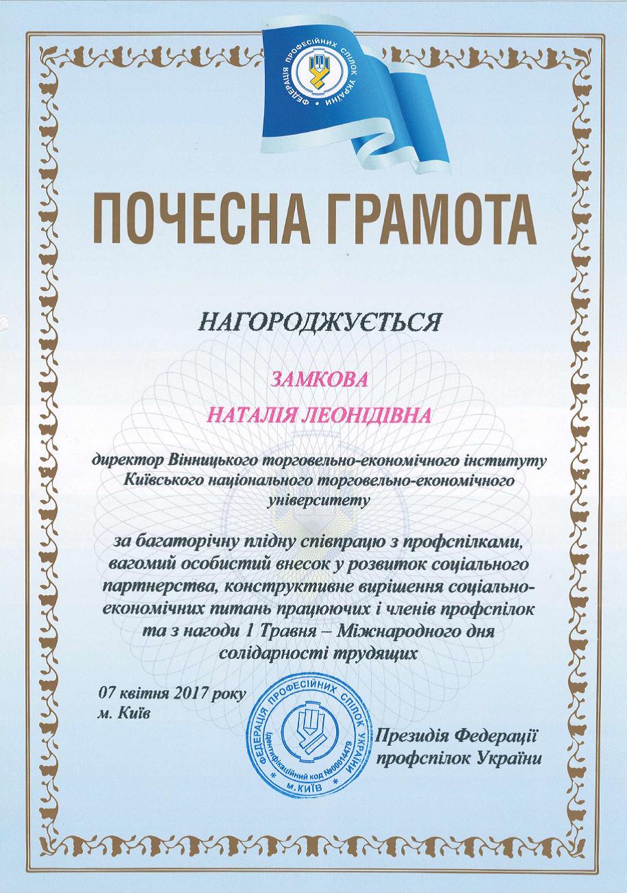 Почесною грамотою Федерації профспілок України нагороджено директора ВТЕІ КНТЕУ Замкову Н.Л. за багаторічну плідну співпрацю з профспілками, вагомий внесок у розвиток соціального партнерства, конструктивне вирішення соціально-економічних питань працюючих і членів профспілок та з нагоди 1 травня Міжнародного дня солідарності трудящих