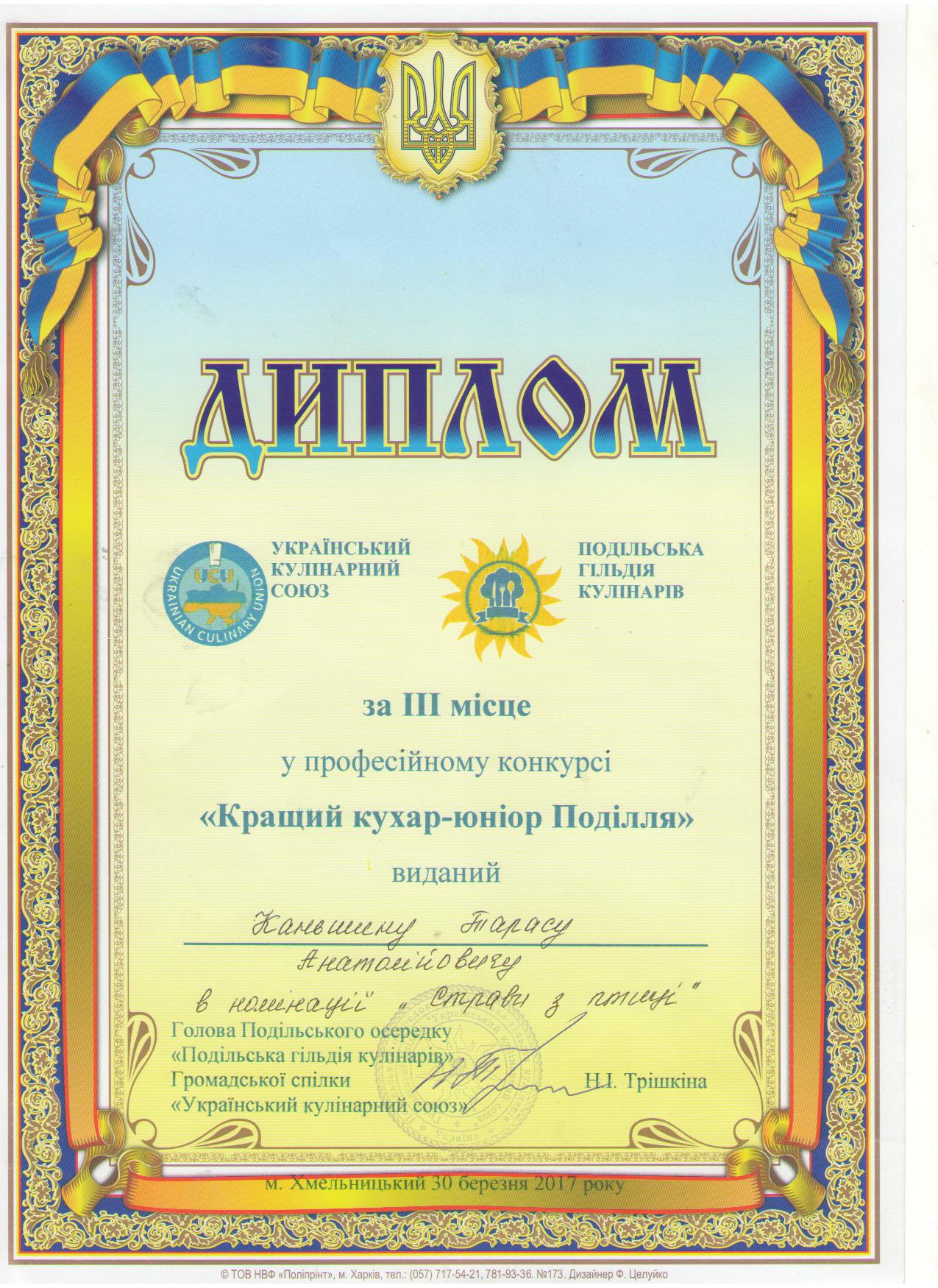 30 березня 2017 року за ініціативою Подільської гільдії кулінарів в Хмельницькому торговельно–економічному коледжі КНТЕУ відбувся кулінарний конкурс «Кращий кухар – юніор Поділля» серед навчальних закладів Подільського регіону у номінаціях: страва з птиці та десерт з яблук. Вінницький торговельно-економічний інститут КНТЕУ представили студенти групи ХТІ–31д Каньшин Тарас та Пастух Богдан під керівництвом викладача кафедри туризму та готельно-ресторанної справи Криворука В.М. За підсумками оцінювання журі страва з птиці «Курячий рулет з яблуком та родзинками» зайняла ІІІ призове місце, бронзову медаль та диплом.