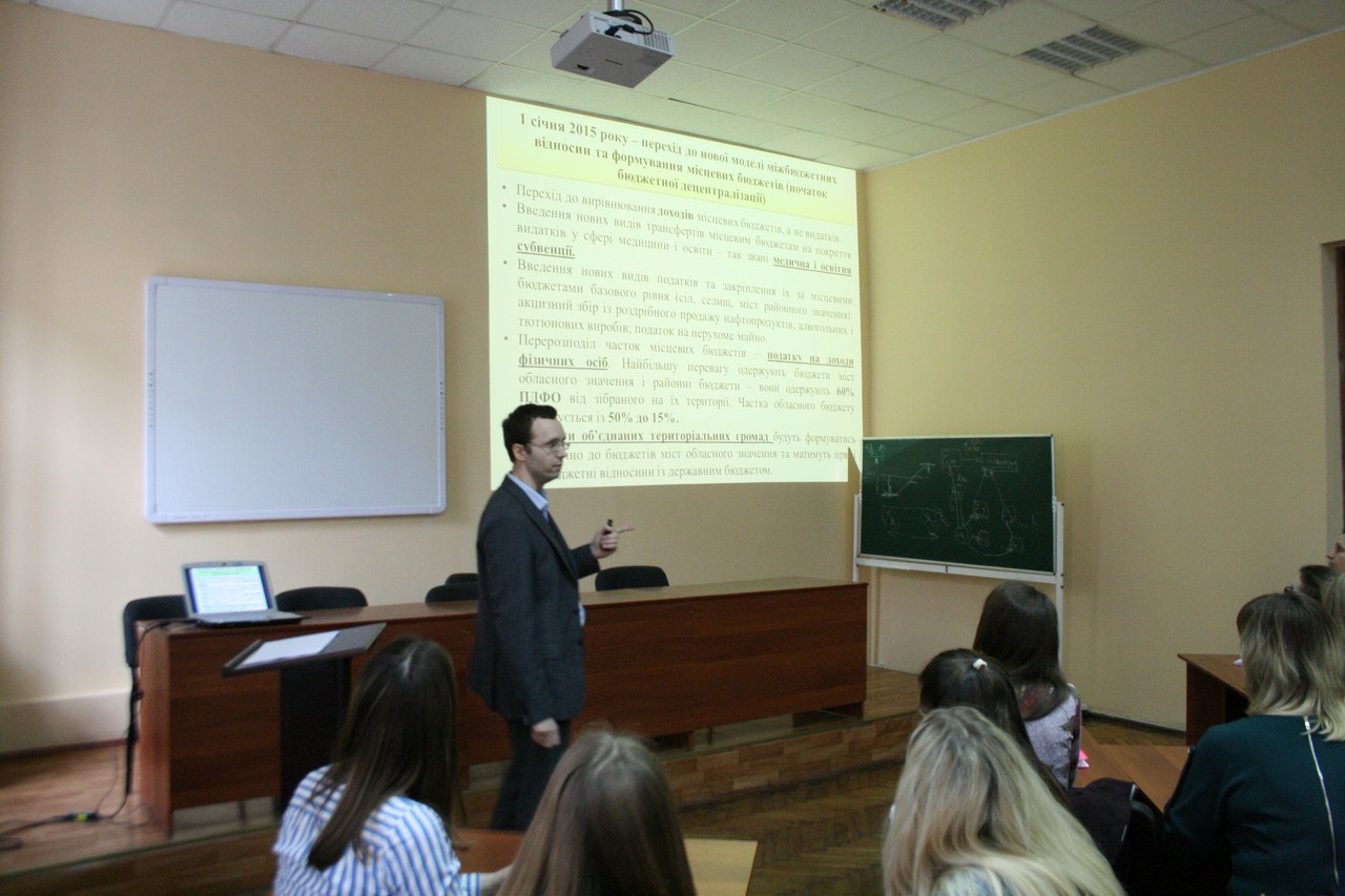 30 березня 2017 року у Вінницькому торговельно-економічному інституті КНТЕУ відбувся майстер-клас керівника відділу аналізу обласних програм Вінницької обласної ради Максима Петровича Мартьянова на тему: «Перспективи нового бюджетного року для Вінницької області в контексті децентралізації та реформування міжбюджетних відносин в Україні». На зустрічі були присутні заступник завідувача кафедри фінансів Гнидюк І.В., заступник декана обліково-фінансового факультету Копняк К.В., викладачі кафедри фінансів та здобувачі освітнього ступеня «бакалавр» спеціальності «Фінанси і кредит».