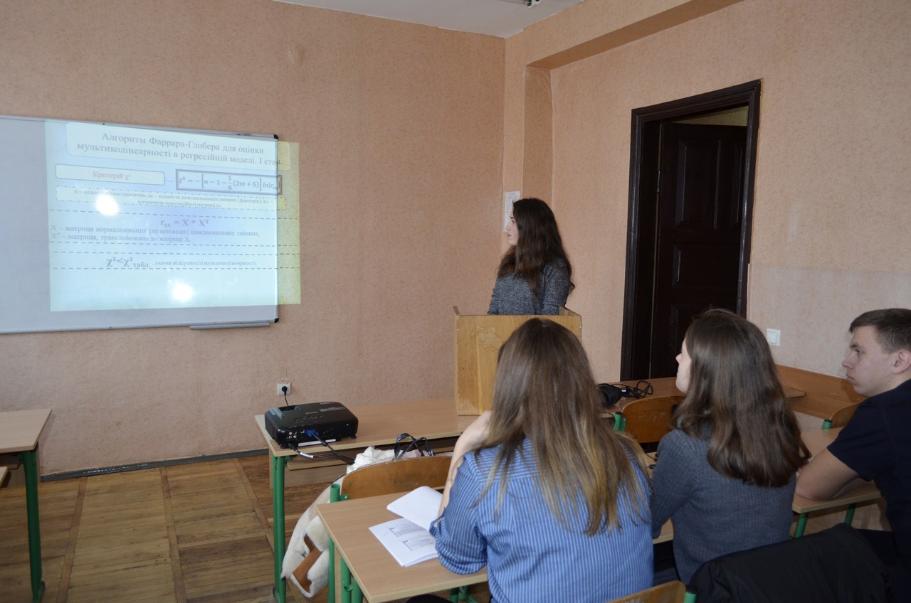 З вступним словом до учасників наукового гуртка звернулася керівник гуртка, к.е.н., старший викладач кафедри обліку та оподаткування С.П. Ковальчук, яка акцентувала увагу на важливості реалізації аналітичних функцій в системі менеджменту підприємства та вагомості теоретичних знань щодо методики кореляційно-регресійного аналізу і можливостях їх використання в практиці аналізу. Із доповідями виступили 4 доповідачі з числа здобувачів вищої освіти ВТЕІ КНТЕУ, членів наукового гуртка. Дві доповіді були присвячені теоретичним аспектам кореляційно-регресійного аналізу, зокрема доповіді Реки А. М. (тема доповіді: «Методика кореляційно-регресійного аналізу») та Панасюк В. Ю. (тема доповіді: «Математичний апарат кореляційно-регресійного аналізу. Поняття мультиколінеарності»).