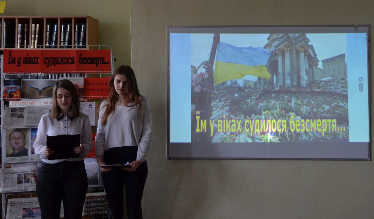 23 лютого 2017 року з метою вшанування пам’яті героїв Небесної Сотні в читальній залі №3 відбулась літературно-патріотична година «Їм у віках судилося безсмертя…», підготовлена працівниками бібліотеки та студентами групи ДФ-11 (куратор Смагло О. В.).
