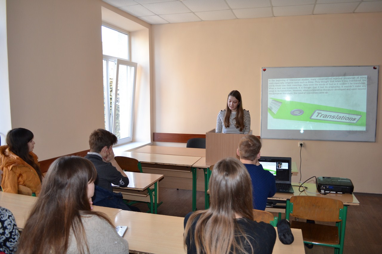 23 лютого 2017 року відбулося відкрите засідання студентського наукового гуртка «Компаративні студії» на тему: «Компаративізм у перекладознавстві». Здобувачі вищої освіти спеціальності «Філологія» з цікавістю долучилися до дослідження тематики заняття. Хейлик Вікторія та Кривко Анна підготували цікаві повідомлення про особливості професії перекладача та про вимоги які висувають до даної професії. Яремко Анастасія, Слободянюк Аліна та Дзигаленко Вероніка підготували інформативні презентації про основні поняття компаративістики як науки, а також про найвизначніших лінгвістів сучасності, які досліджують проблеми компаративістики, а також її зв’язок з перекладознавством та літературознавством.