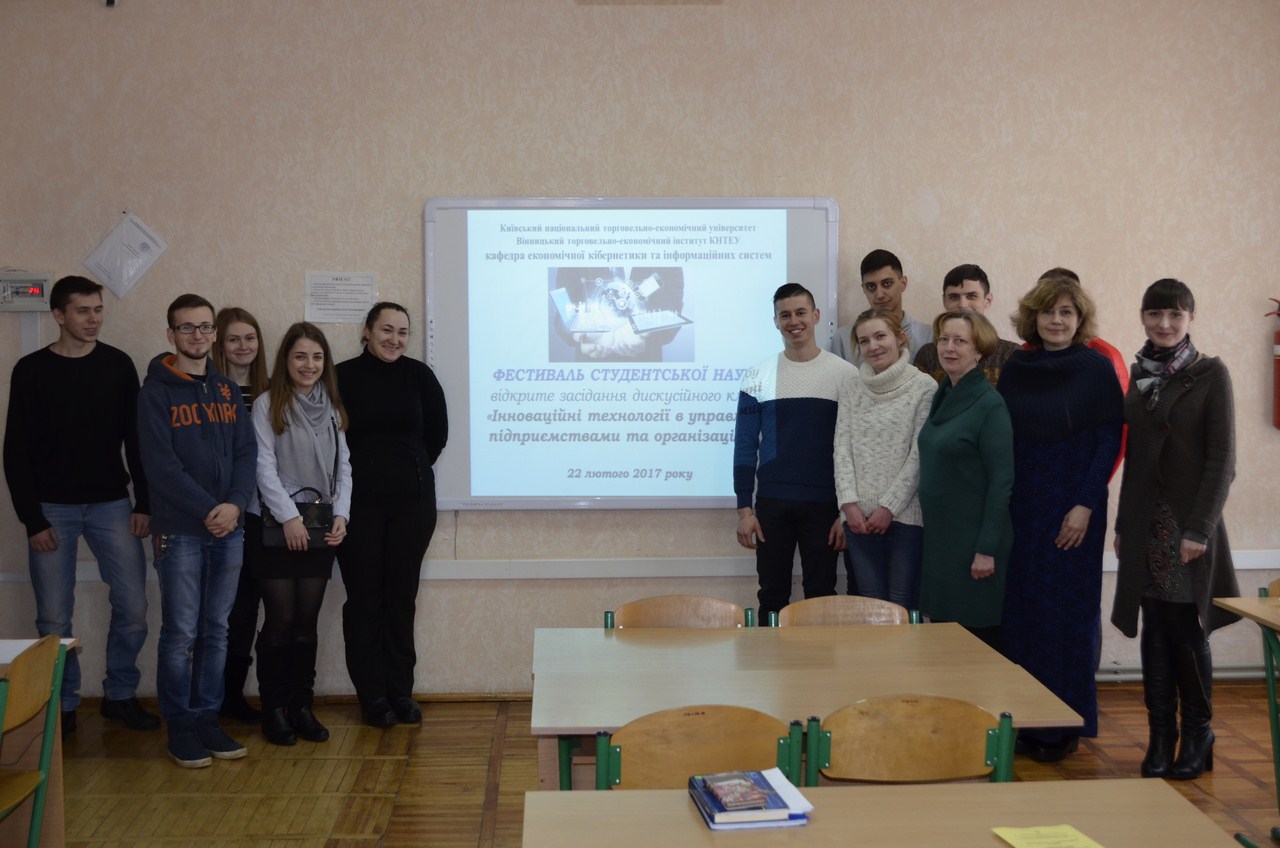 22 лютого 2017 року кафедрою економічної кібернетики та інформаційних систем було проведено відкрите засідання дискусійного клубу «Інноваційні технології в управлінні підприємствами та організаціями». Учасниками даного заходу стали викладачі кафедри економічної кібернетики та інформаційних систем, здобувачі вищої освіти спеціальності «Економічна кібернетика».
