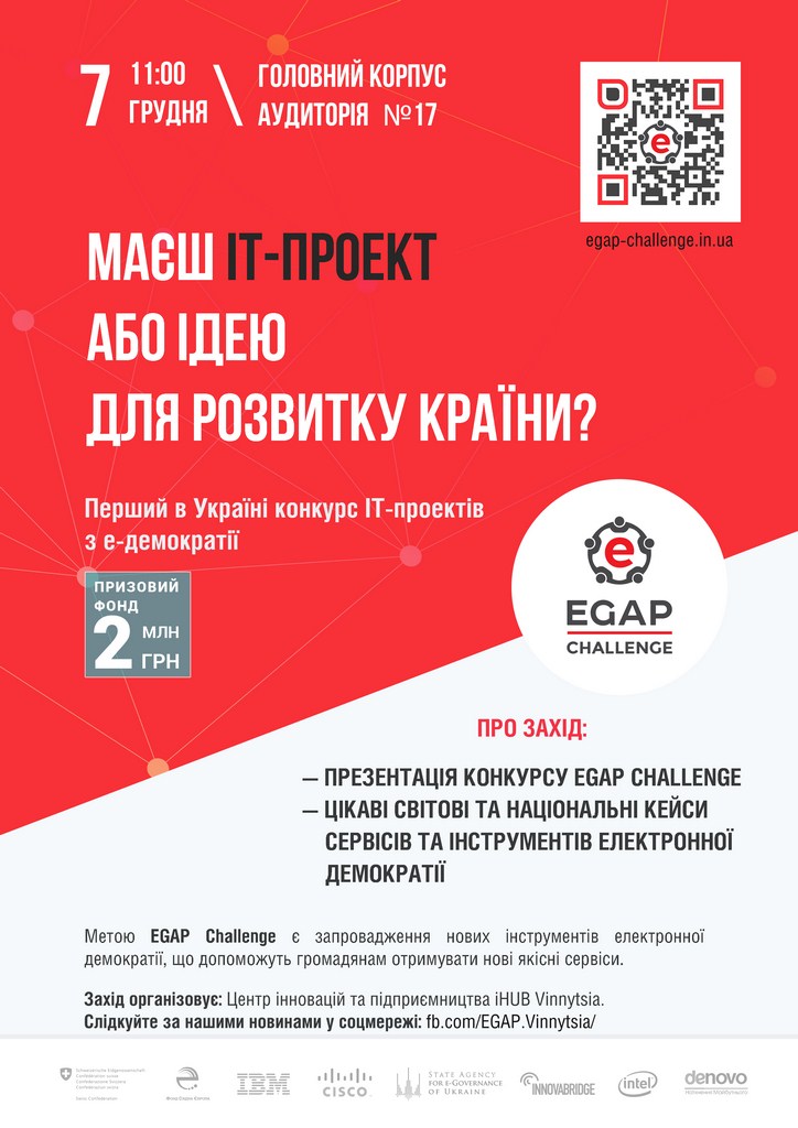 7 грудня 2016 року для студентів факультету економіки, менеджменту та права центром інновацій та підприємництва iHUB Vinnytsia проводилась презентація проекту національного IT-конкурсу EGAP Challenge метою якого є запровадження нових інструментів електронної демократії, що допоможуть громадянам отримувати нові якісні сервіси. Призовий фонд конкурсу становить 2 000 000 гривень.