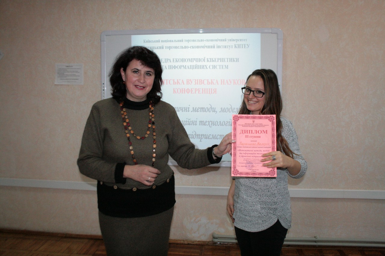 15 листопада 2016 року на базі кафедри економічної кібернетики та інформаційних систем Вінницького торговельно-економічного інституту КНТЕУ проведено вузівську студентську наукову конференцію на тему: «Математичні методи, моделі та інформаційні технології в управлінні підприємством». В конференції взяли участь 35 здобувачів вищої освіти, які підготували 29 доповідей за такими науковими напрямками: «Математичні методи, моделі аналізу і прогнозування соціально-економічних та фінансово-господарських систем і процесів» та «Впровадження інформаційних технологій в управління бізнес-процесами, створення єдиного інформаційного середовища для забезпечення ефективного управління підприємством».