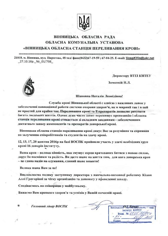 На адресу ВТЕІ КНТЕУ надійшов лист-подяка від Вінницької обласної станціії переливання крові за сприяння по залученню співробітників та студентів на здачу крові.