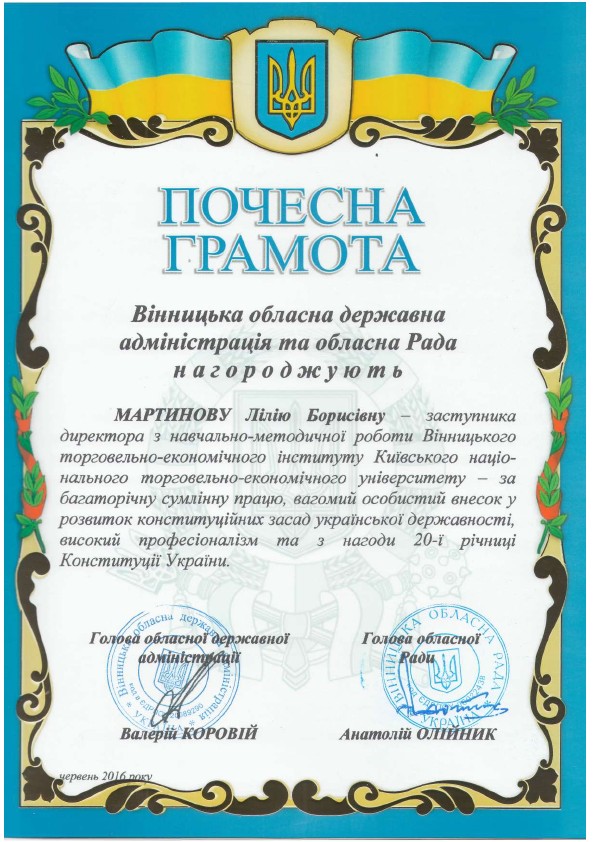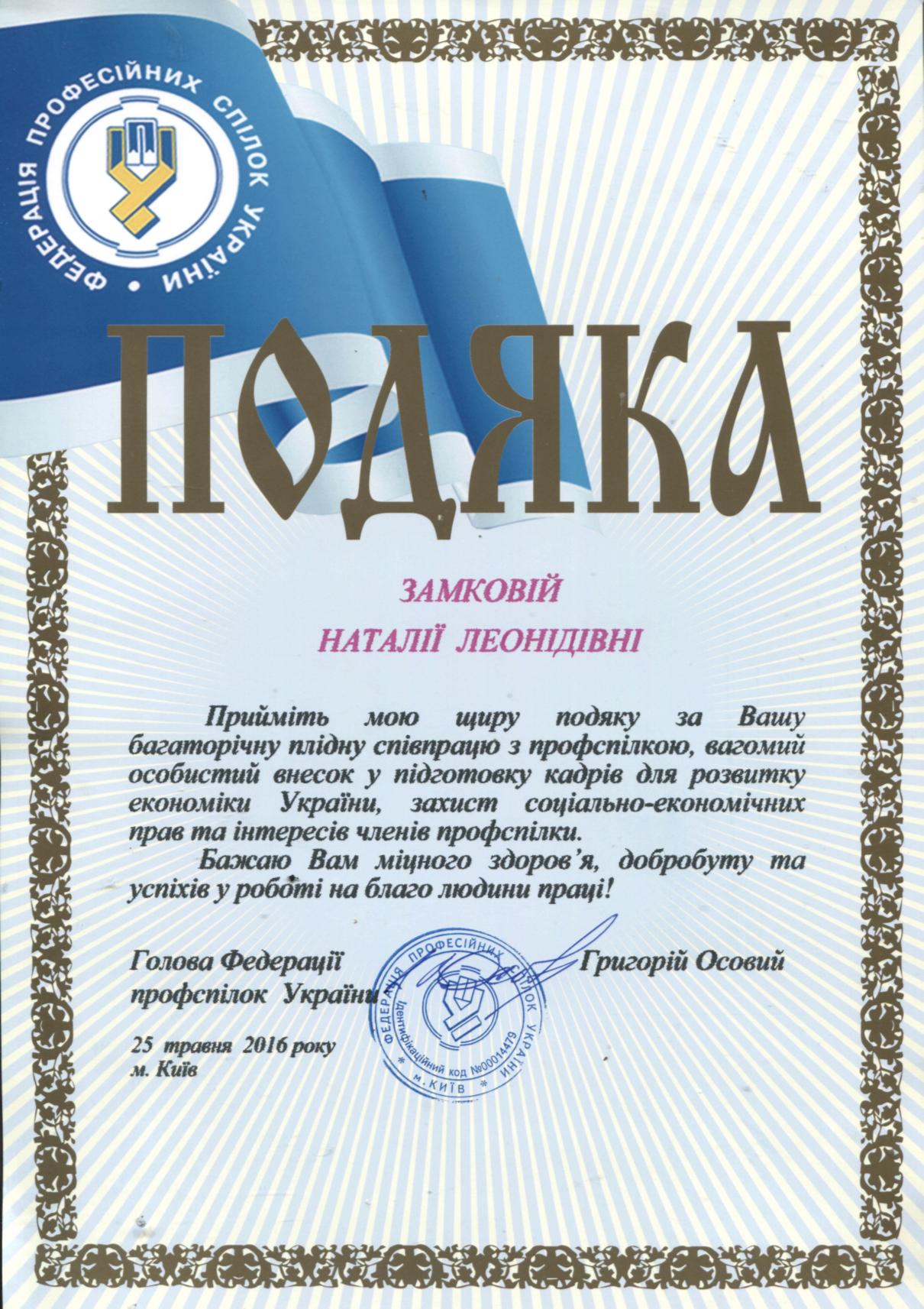 Директору Вінницького торговельно-економічного інституту КНТЕУ Замковій Наталії Леонідівні за багаторічну плідну працю з профспілкою, вагомий особистий внесок у підготовку кадрів для розвитку економіки України, захист соціально-економічних прав та інтересів членів профспілки оголошено подяку від Федерації професійних спілок України.
