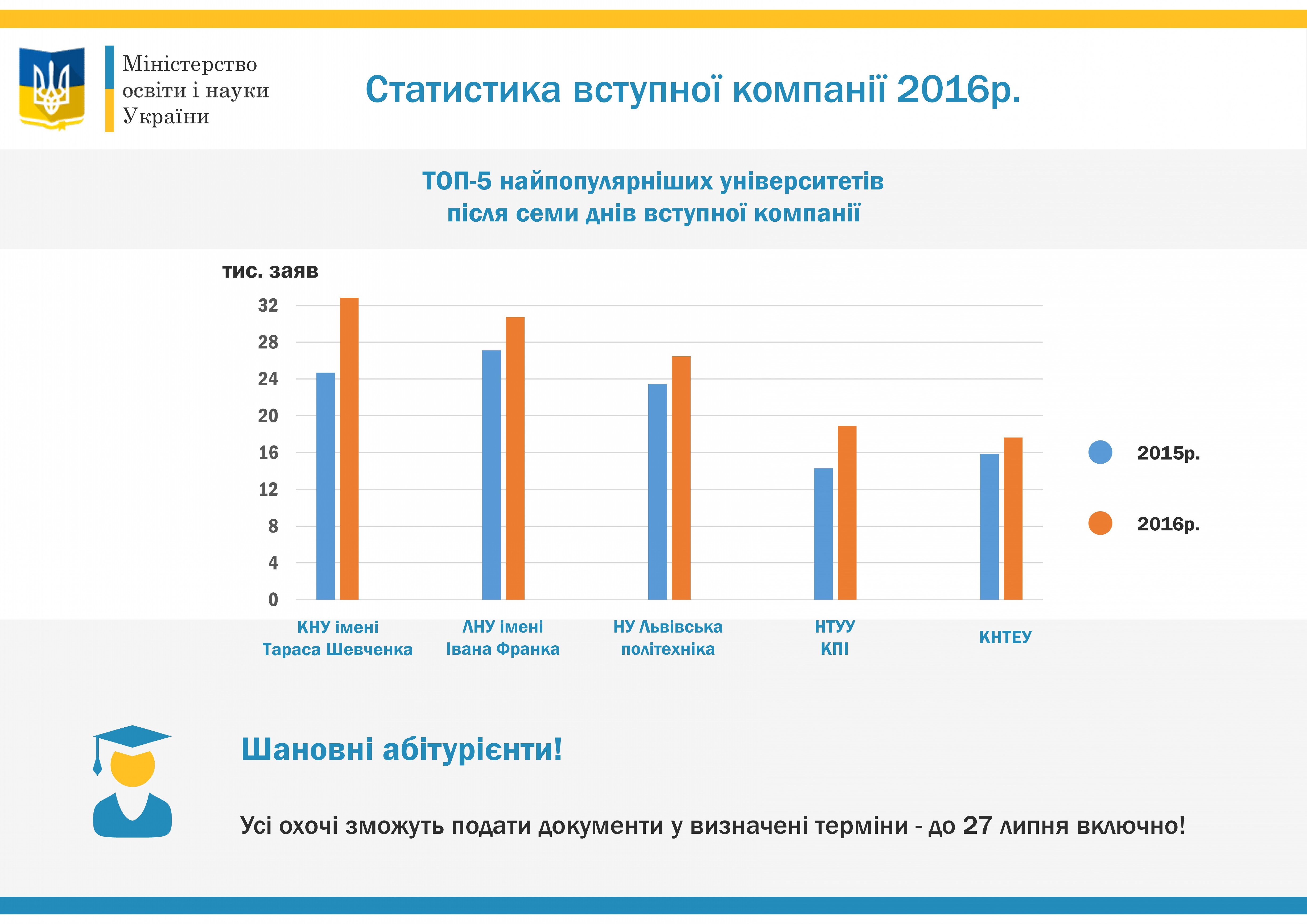 За даними Міністерства освіти і науки України, після семи днів вступної кампанії Київський національний торговельно-економічний університет посідає 5 місце в країні за кількістю поданих абітурієнтами заяв до ВНЗ – 17 640.