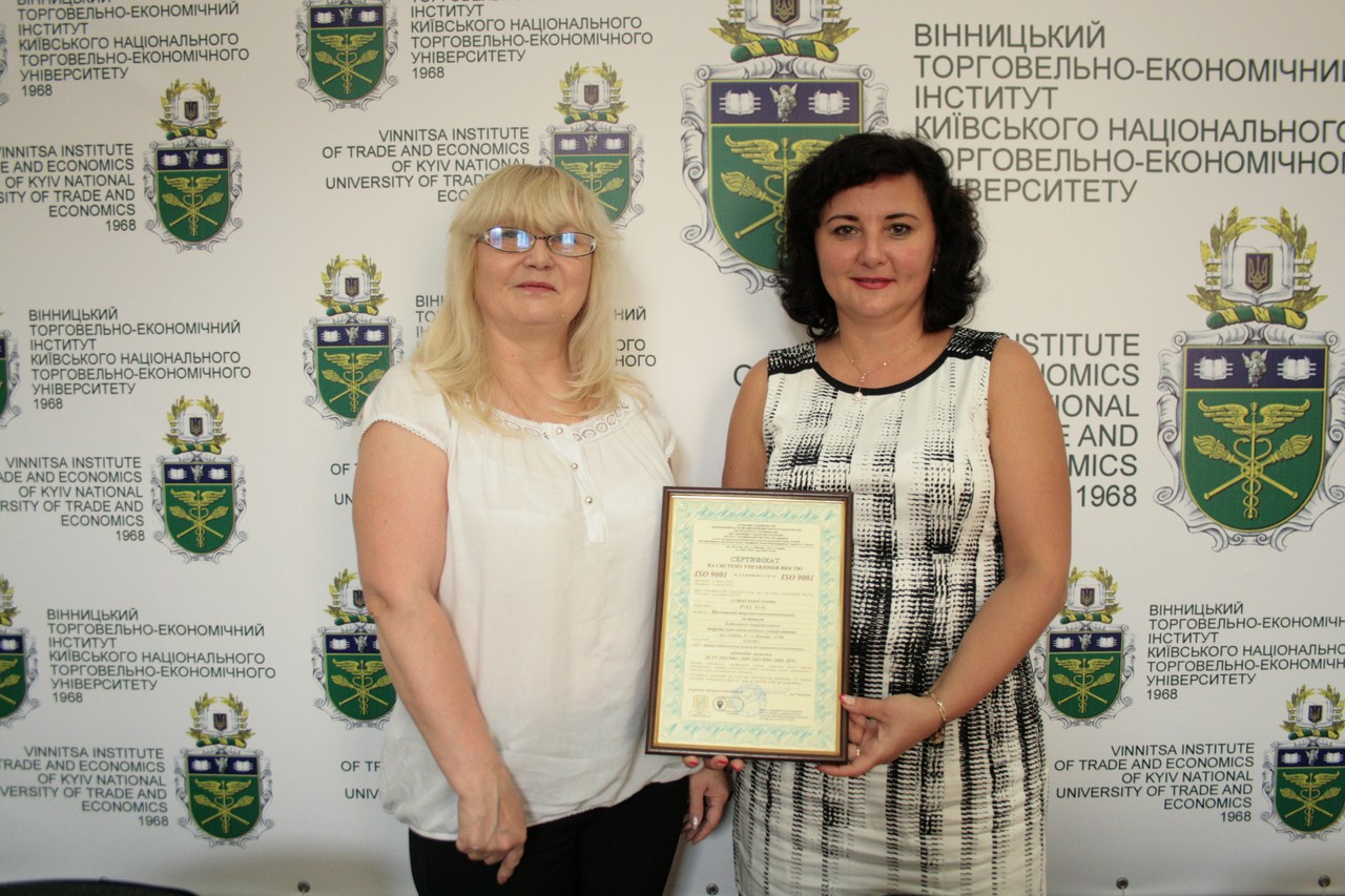 22 червня 2016 року в урочистій обстановці колективу ВТЕІ КНТЕУ в особі директора інституту Замкової Н.Л. було вручено сертифікат на систему управління якістю. Отриманню сертифікату передувала напружена кількамісячна підготовча робота та два етапи сертифікаційного аудиту, які засвідчили високий рівень управління освітньою діяльністю. Сертифікат вручила заступник генерального директора ДП «Вінницястандартметрологія» Іонова С.В.