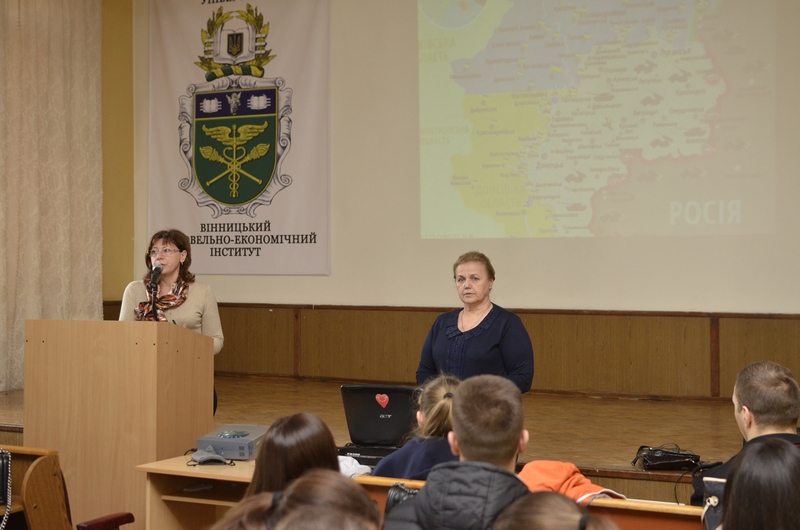 31 березня перед студентами виступила відомий волонтер Юлія Вотчер, президент ГО «МОЛЬФАР», яка не зважаючи на небезпеку та обстріли доставляє гуманітарну допомогу в гарячі точки зони АТО. Відбулася бесіда з показом фотографій. За кожною фотографією студенти побачили людську долю.