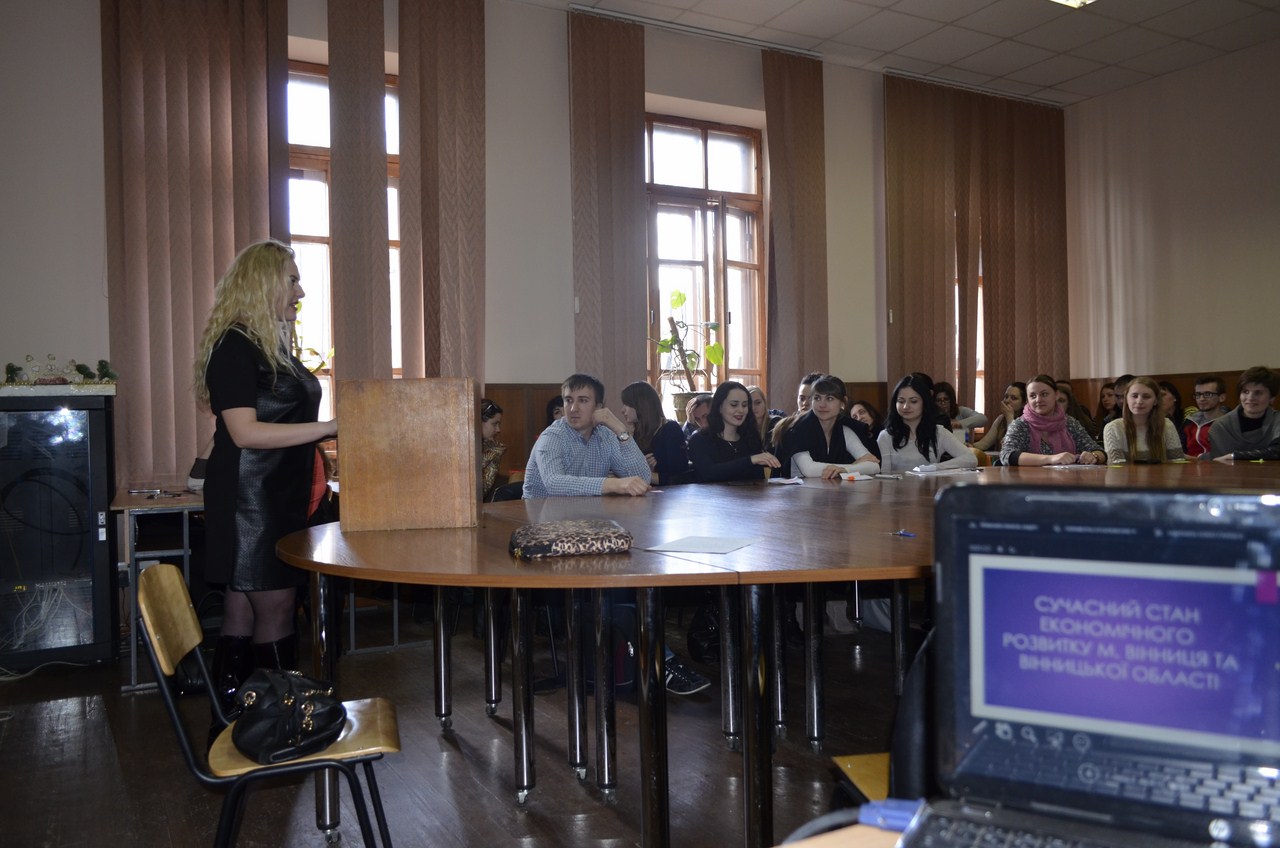 14 квітня 2015 року о 14:00 в 2 корпусі, ауд. 27, відбулось засідання гуртка з економіки підприємства на тему: "Сучасний стан економічного розвитку Вінницької області". У засіданні прийняли участь студенти гр. ДФК-31, ДФК-21, ОАП-31, ЕК-31, МТБ-31, МЗД-21, МО-11, загалом 58 студентів під керівництвом к.е.н., доц. Чорною Н.Ю.