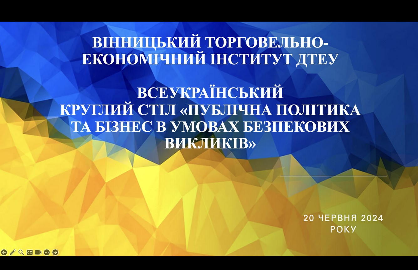 20 червня 2024 року у Вінницькому торговельно-економічному інституті ДТЕУ відбувся Всеукраїнський круглий стіл на тему «Публічна політика та бізнес в умовах безпекових викликів», організований кафедрою менеджменту та адміністрування.