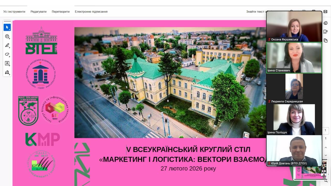 27 лютого 2026 року у Вінницькому торговельно-економічному інституті ДТЕУ відбулася наукова подія - V Всеукраїнський круглий стіл на тему «Маркетинг і логістика: вектори взаємодії». Захід, що проходив у режимі онлайн на платформі Zoom, об’єднав провідних науковців, практиків та аспірантів навколо пошуку ефективних стратегій розвитку українського бізнесу.