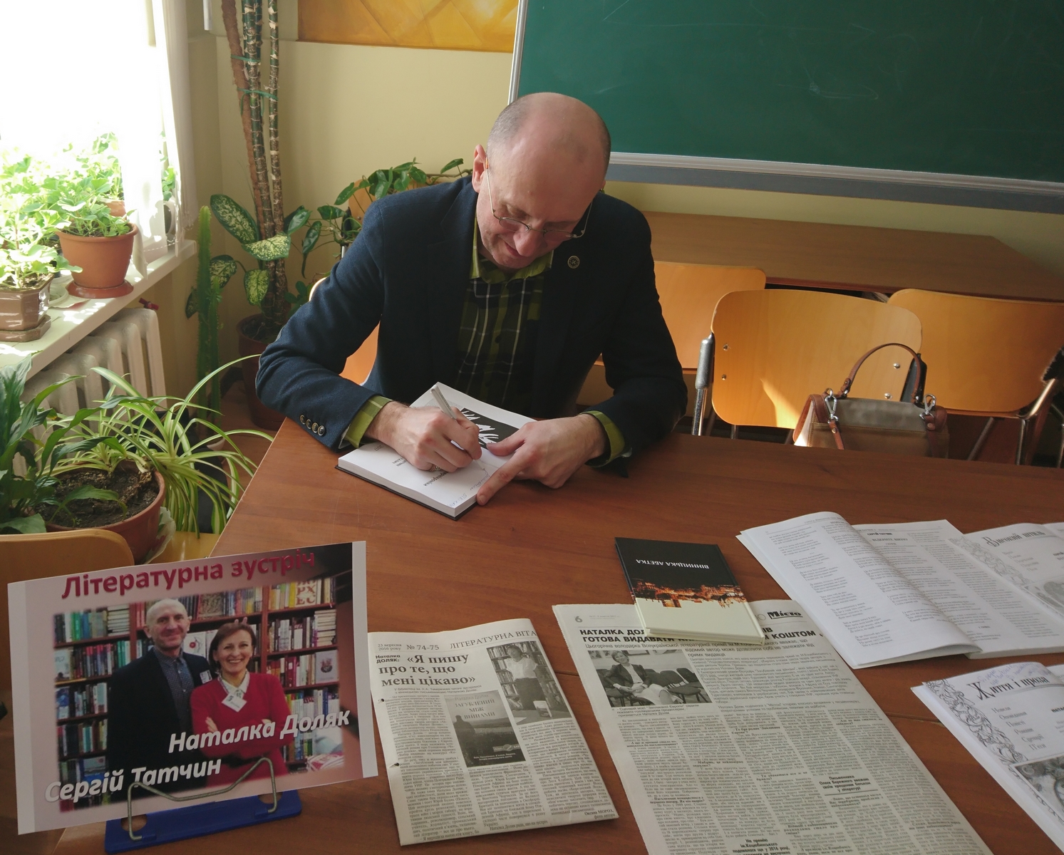 22 березня 2018 року в читальній залі ВТЕІ КНТЕУ відбулась зустріч з творчими, щирими, відкритими до спілкування вінницькими літераторами - письменником, журналістом, драматургом, талановитою та багатогранною Наталкою Доляк, яка не вперше завітала до бібліотеки та поетом, художником, надзвичайно цікавою людиною - Сергієм Татчиним.