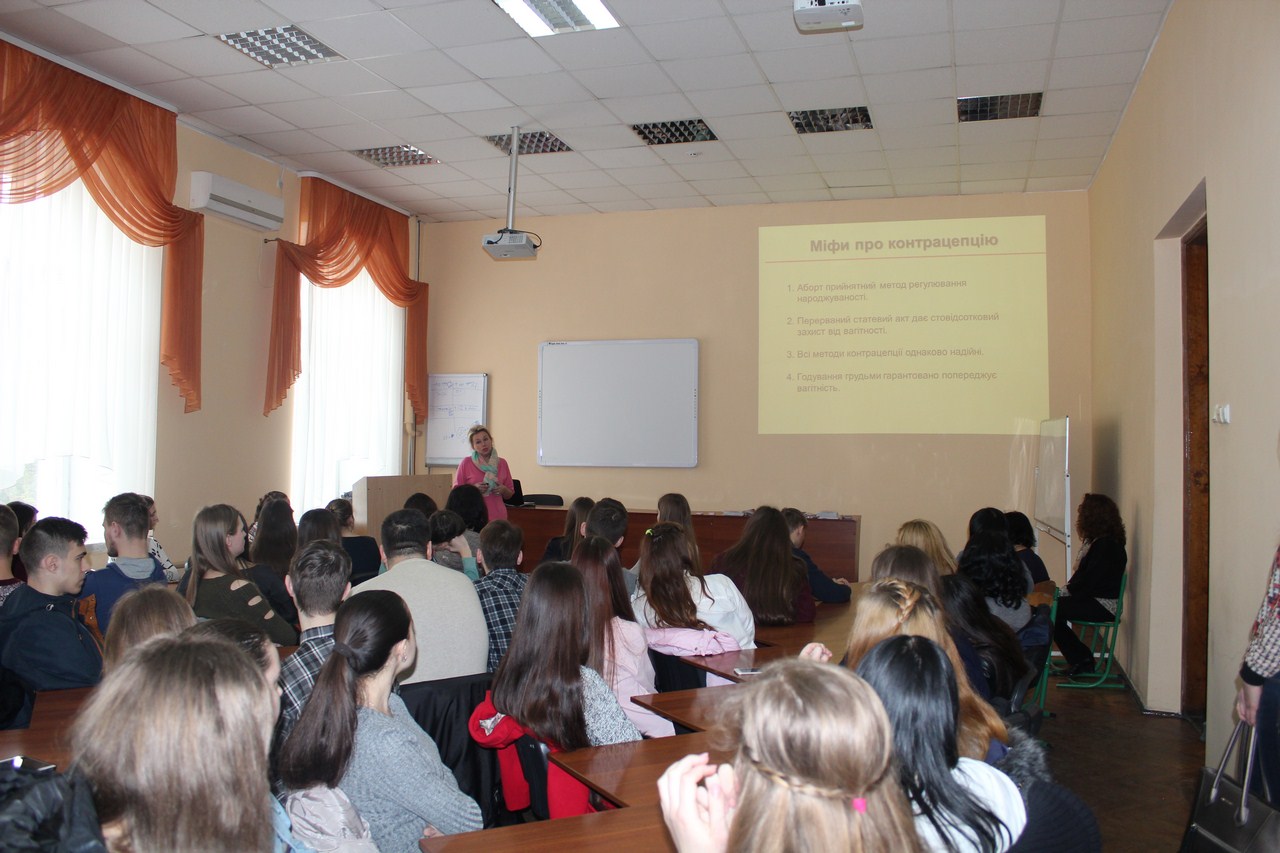 29 березня для студентів перших курсів була проведена зустріч з лікарем вищої категорії Центру планування сім’ї, репродукції людини і медико-генетичного консультування лікарем акушером-гінекологом Оксаною Богданівною Ластовецькою, темою якої була «Репродуктивне здоров’я: його значення та збереження». Оксана Богданівна розповіла про сучасні засоби контрацепції та важливість їх застосування, й продемонструвала презентацію про репродуктивне здоров’я та контрацепцію, розповіла про інфекції, які передаються статевим шляхом, симптоми хвороб та засоби попередження їх виникнення. Зустріч була цікавою та пізнавальною. Студентам роздано роздатковий матеріал, який містить важливу та актуальну інформацію.