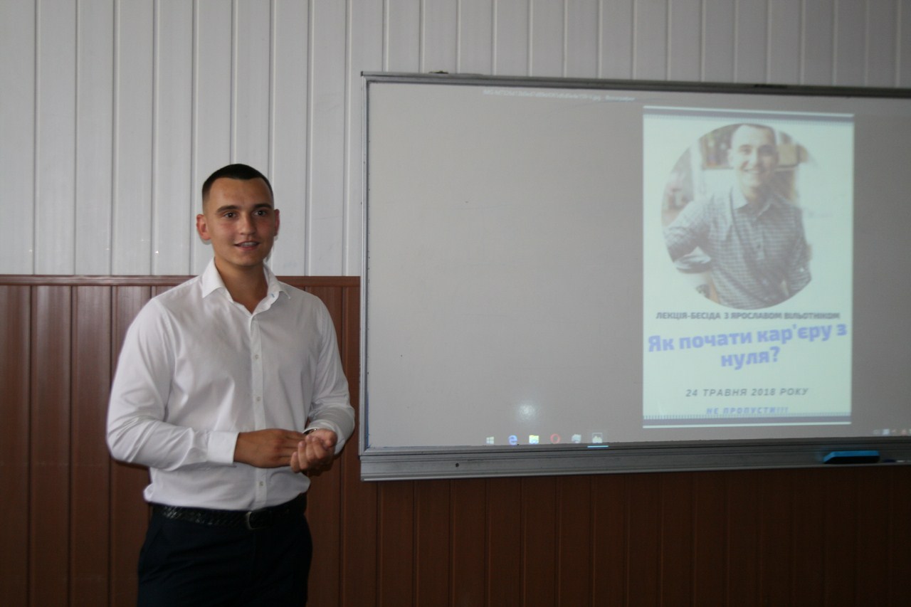24 травня 2018 року відбулася лекція-бесіда «Як почати кар’єру з нуля?» за участю власника молодіжної кав’ярні «Starvin Coffee» Ярослава Вільотніка. Організаторами виступили: студентське наукове товариство «ВАТРА», відділ наукової роботи та міжнародної співпраці. На лекції здобувачі вищої освіти дізналися ключові моменти та отримали професійні настанови щодо відкриття власного бізнесу навіть при незначній кількості стартового капіталу. Зустріч пройшла у легкій та доброзичливій атмосфері.