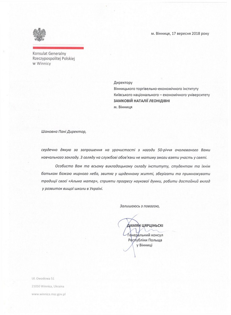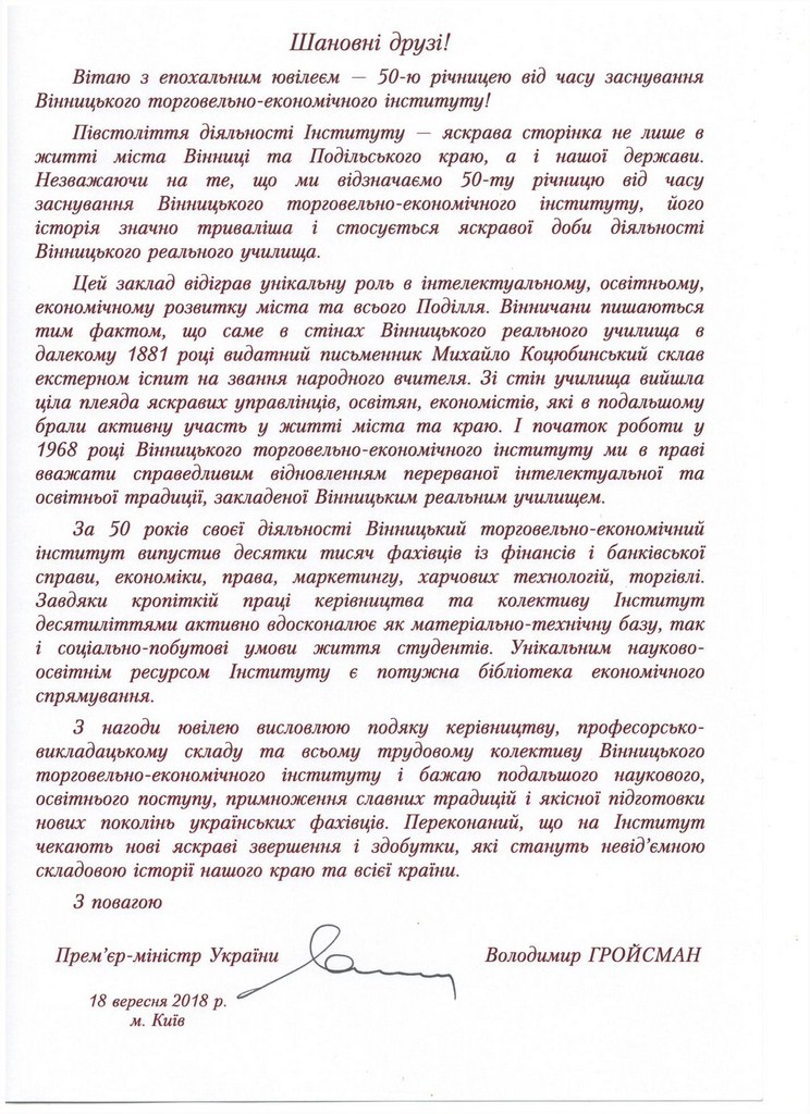 18 вересня 2018 року відбулись урочисті заходи з нагоди 50-річного ювілею з дня заснування Вінницького-торговельно-економічного інституту Київського національного торговельно-економічного університету.