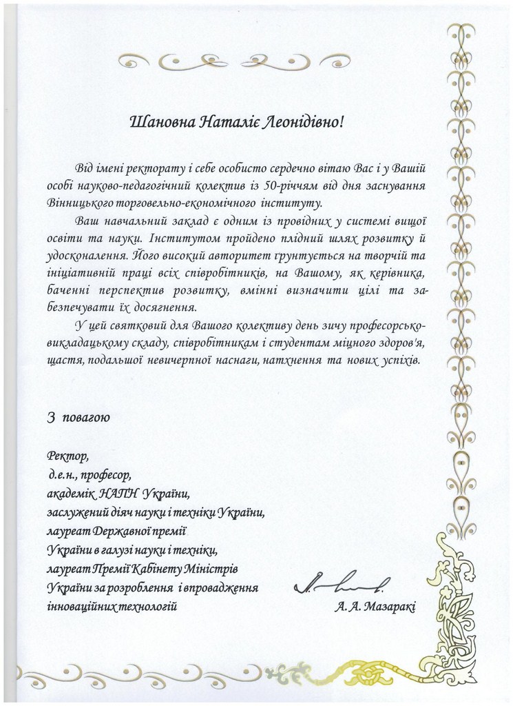 Наталія Леонідівна отримала від ректора Мазаракі А.А. почесну відзнаку КНТЕУ «Гідному шани», а кращі працівники інституту почесні грамоти та подяки КНТЕУ за сумлінну працю, високий професіоналізм, зразкове виконання посадових обов’язків та з нагоди 50-річчя заснування Вінницького торговельно-економічного інституту КНТЕУ.