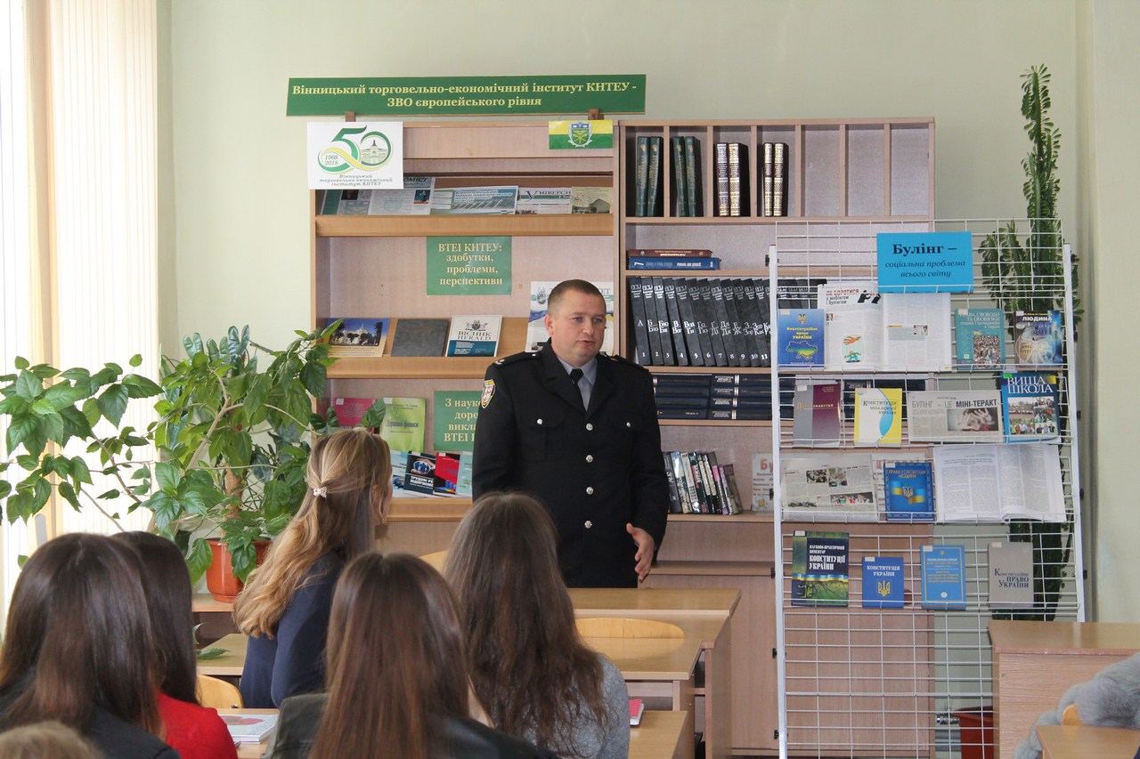 3 жовтня 2018 року відбулося засідання наукового гуртка «Феміда» на тему: «Булінг у закладах освіти» (науковий керівник к.ю.н., доцент кафедри права Білоус І.М.). Участь у науковому заході брали студенти, які навчаються за спеціальністю «Право», а також до обговорення теми був запрошений гість – інспектор сектору ювенальної превенції Вінницького відділу поліції ГУНП у Вінницькій області майор поліції Олександр Володимирович Печенюк. Працівники бібліотеки ВТЕІ КНТЕУ підготували інформаційний стенд «Булінг – соціальна проблема всього світу».