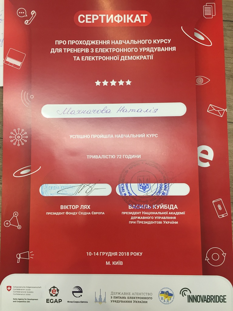 З 10 по 14 грудня 2018 року, в рамках освітнього компоненту Швейцарсько-українська Програми EGAP було проведено тренінг для тренерів з е-урядування та е-демократії, де взяли участь представники кафедри менеджменту та адміністрування доцент Махначова Н.М. та старший викладач Семенюк І.Ю.