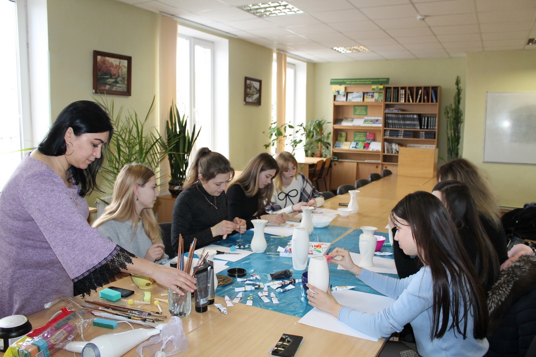 01 березня 2019 року, в рамках святкування тижня факультету економіки, менеджменту та права, майстринею-художницею Галиною Кривуш було проведено майстер-клас по художньому оформленню скла та кераміки в техніці кракелюр.