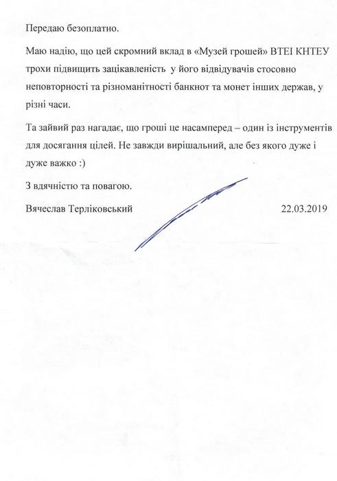 Адміністрація інституту щиро висловлює подяку випускнику інституту Терліковському В.В. за поповнення скарбниці Музею грошей Вінницького торговельно-економічного інститут КНТЕУ.
