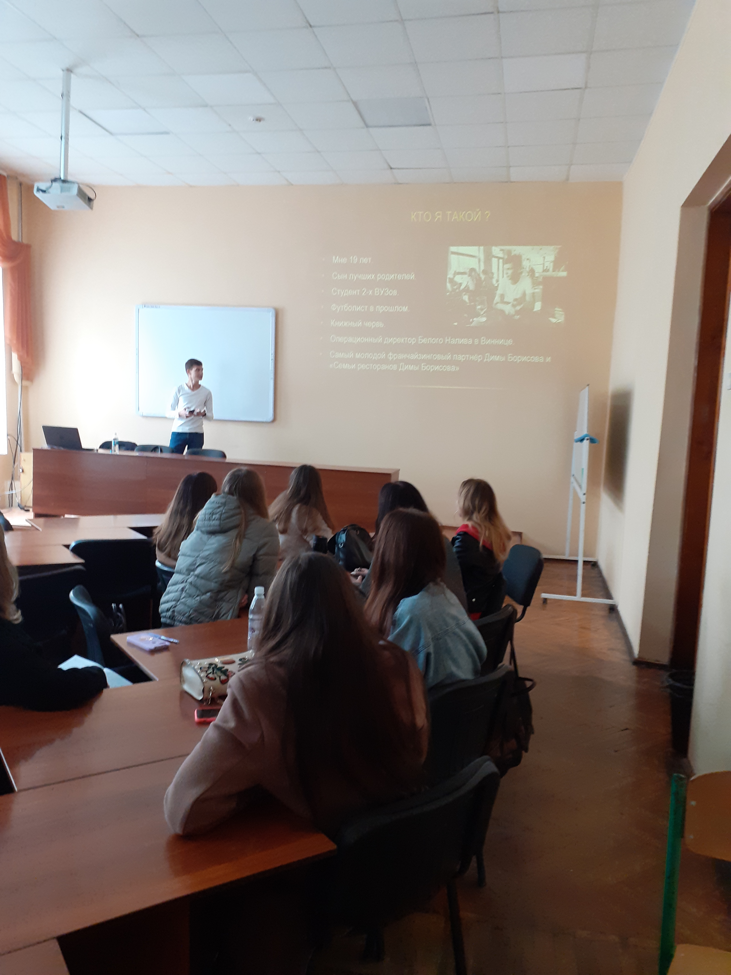 22 жовтня 2019 року в рамках проведення Днів факультету торгівлі, маркетингу та сфери обслуговування відбувся семінар «Франчайзинг в ресторанному бізнесі», організований кафедрою туризму та готельно-ресторанної справи для здобувачів вищої освіти спеціальності «Готельно-ресторанна справа». Спікером виступив операційний директор бару у форматі «1 euro» від «сім’ї ресторанів» Дмитра Борисова «Білий налив» Антон Зарічнюк. Семінар пройшов в дружній атмосфері спілкування, під час якого студенти дізналися про особливості розвитку франчайзингу в різних сферах діяльності, переваги та недоліки франчайзингу в ресторанному бізнесі, «підводні» камені його розвитку, а також могли переконатися в перспективності розвитку франчайзингового бізнесу в країні.