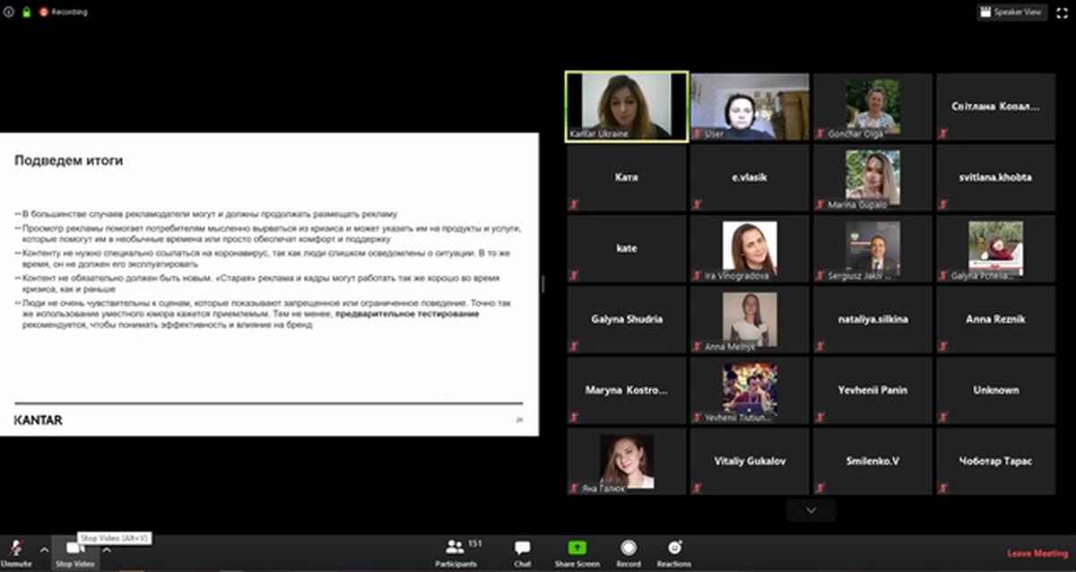 27 квітня 2020 року викладачі ВТЕІ КНТЕУ та здобувачі вищої освіти ОП «Міжнародний бізнес» ОС «бакалавр», ОП «Маркетинг» ОС «молодший бакалавр», «бакалавр», «магістр», ОП «Публічне управління та адміністрування» ОС «бакалавр» прийняли участь у воркшопі «Відношення споживачів до реклами в часи COVID-19 в світі» – від провідної у світі дослідницької компанії – «Kantar Україна».