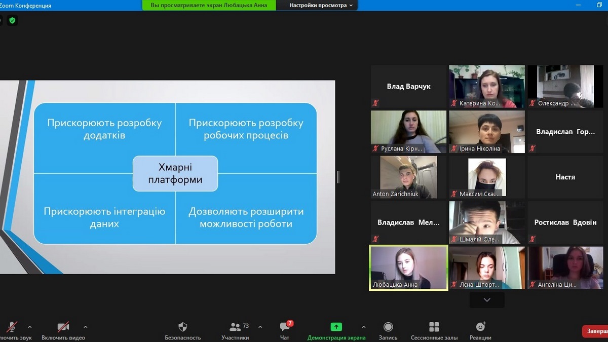 Всі доповіді були цікавими та різносторонніми, проте як найбільш ґрунтовні слід відзначити презентації Любацької Анни, Зарічнюка Антона, Облапінського Олександра та Бондаренко Вікторії. Всього в роботі конференції взяло участь 78 слухачів. Доповіді викликали жваве онлайн-обговорення серед студентів та викладачів.