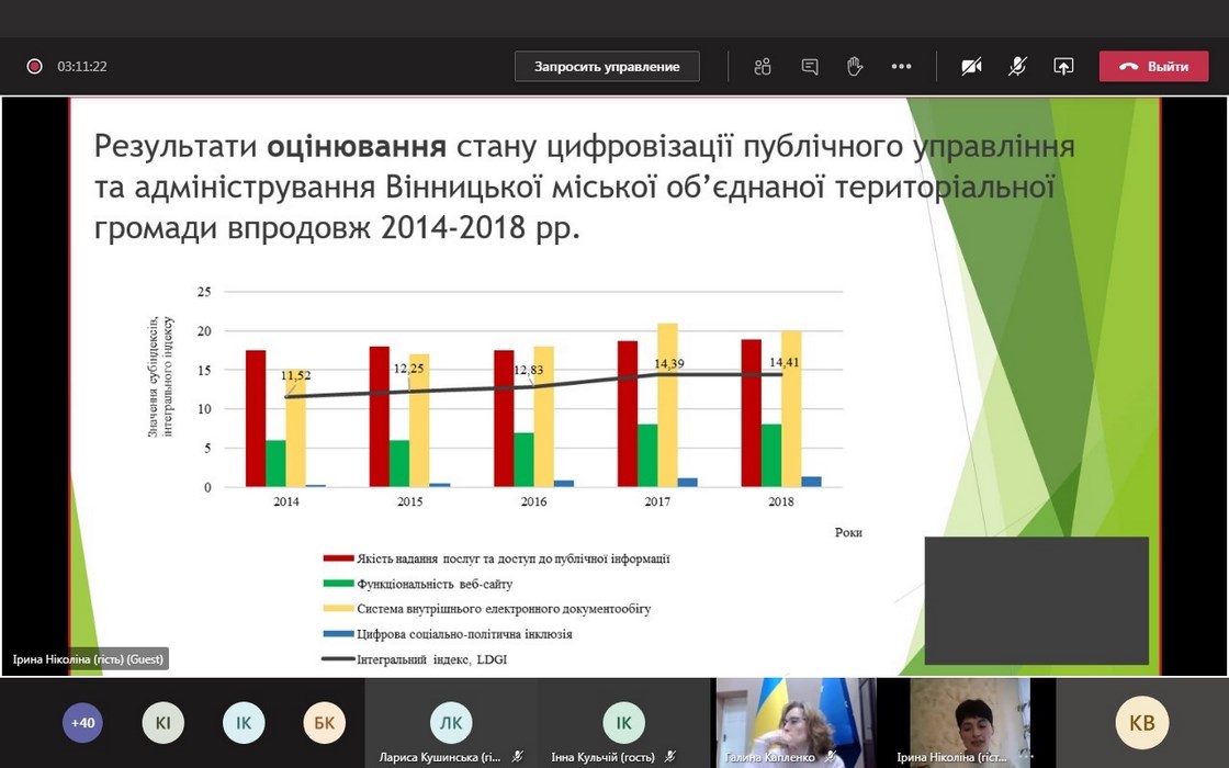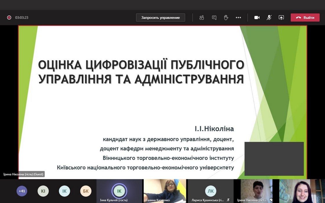На пленарному засіданні виступила доцентка кафедри менеджменту та адміністрування Ніколіна І.І. з доповіддю «Оцінка цифровізації публічного управління та адміністрування», яка проаналізувала і візуалізувала результати оцінювання цифрових трансформацій в Україні на основі міжнародних індексів та висвітлила результати оцінювання стану цифровізації публічного управління та адміністрування на місцевому рівні на прикладі Вінницької міської об’єднаної територіальної громади.
