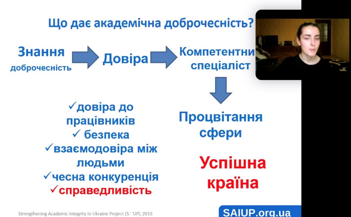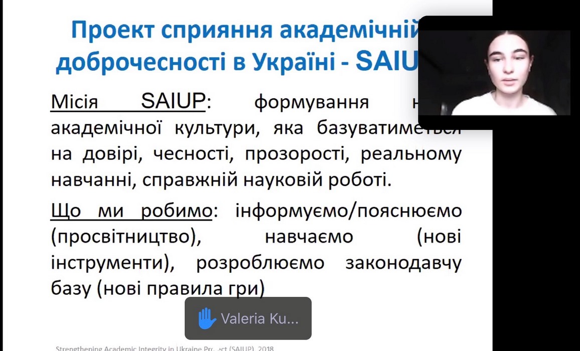 Гарант ОП «Публічне управління та адміністрування» Наталя Махначова зазначила, що питання академічної доброчесності не знаходиться лише в площині «покарати», це питання формування культури доброчесної академічної поведінки. Проблема плагіату актуальна від моменту списування до незаконного запозичення чужого тексту. На разі, студенти різних курсів спеціальності «Публічне управління та адміністрування» займаються написанням наукових тез, статей, курсових та бакалаврських робіт, тому грамотний і справедливий підхід до формування власних наукових здобутків сформує доброчесну поведінку майбутніх спеціалістів, як наслідок – успішної країни.