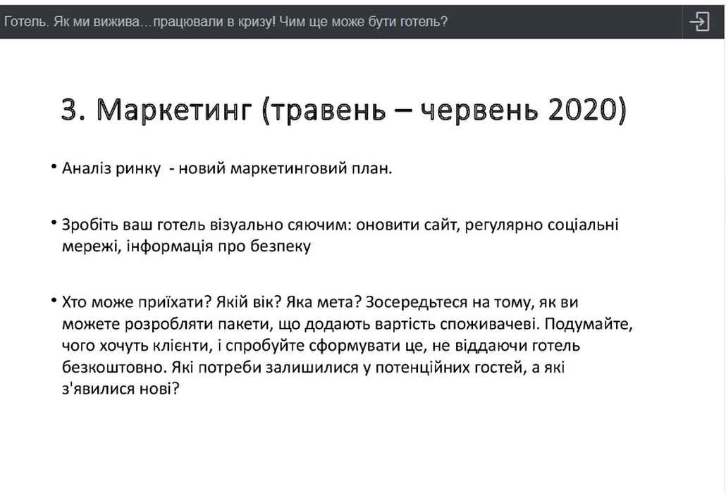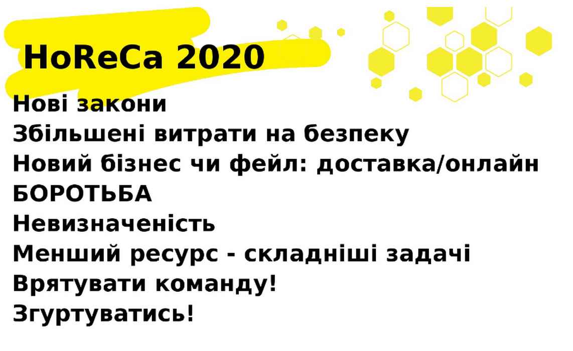 О. Мартусевич представила власну оцінку викликів, з якими у 2020 р. довелося зіткнутися готелярам та рестораторам, у зв’язку з пандемією covid-19. Серед головних порад, якими експертка рекомендує скористатися власникам бізнесу у сфері HoReCa – більш обдумано та виважено планувати доходи та витрати закладу, максимально прозоро та чесно працювати з інвесторами та кредиторами, розробити та реалізовувати новий маркетинговий план діяльності, переглянути низькопродуктивні площі та перепрофілювати ці приміщення, віднайти додаткові джерела доходів, ін. І, звісно ж, - ще більше уваги приділяти кожному гостю закладу та дбати про його безпеку.