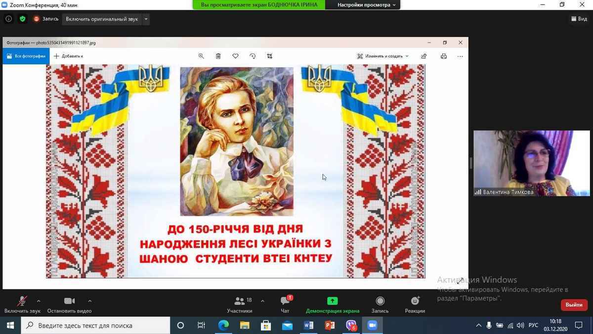 Наступного року Україна буде відзначати 150-річчя видатної дочки нашої держави, письменниці, перекладачки, культурної діячки Лесі України. Відомо, що митець живе у своїх творах. Саме під таким гаслом 3 грудня 2020 р. доцент кафедри іноземної філології та перекладу Валентина Тимкова провела інформаційно-просвітницький захід для студентів-першокурсників. Учасники заходу говорили про те, що ім’я Лесі Українки увійшло у свідомість поколінь як символ мужності і стійкості, а її твори, сповнені прометеївським вогнем любові до людей, і сьогодні не втрачають актуальності.