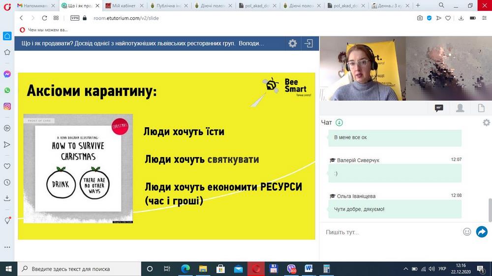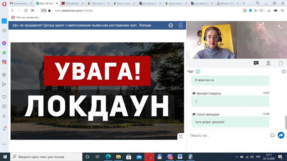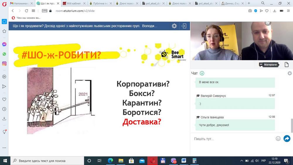 22 грудня 2020 року науково-педагогічні працівники кафедри туризму та готельно-ресторанної справи, здобувачі вищої освіти, які навчаються за спеціальностями «Харчові технології», «Готельно-ресторанна справа», взяли участь у вебінарі «Що і як продавати? Досвід однієї з найпотужніших львівських ресторанних груп», який відбувся в рамках міні-курсу «Як правильно запустити доставку?».