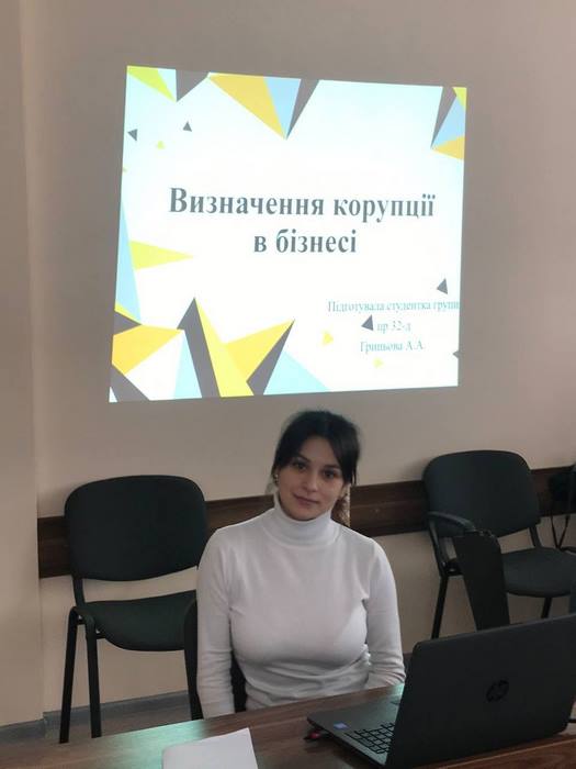 Члени гуртка виступили з доповідями та обоговорили актуальні питання на наступні теми: «Визначення корупції в бізнесі» доповідач студентка групи ПР-32д Альбіна Гриньова; «Правовий захист підприємництва» доповідач студентка групи ПР-32д Марина Раситюк.