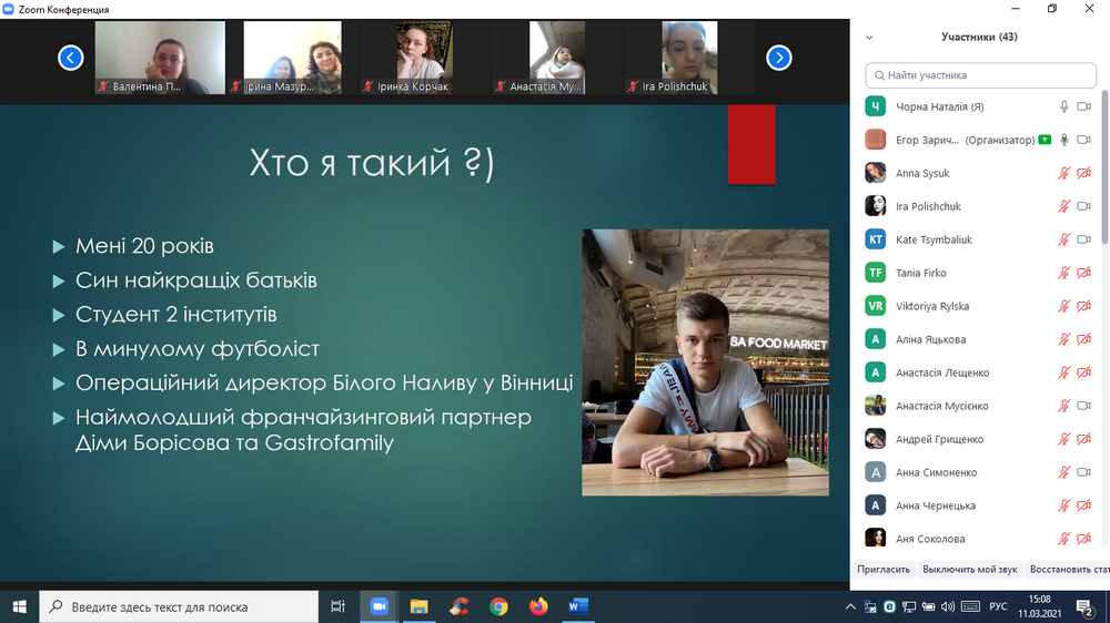 11 березня 2021 року кафедрою туризму та готельно-ресторанної справи було організовано семінар на тему: «Особливості діяльності закладів ресторанного господарства в умовах карантинних обмежень», доповідачем на якому виступив операційний директор бару-сидерії «Білий налив» Антон Зарічнюк.
