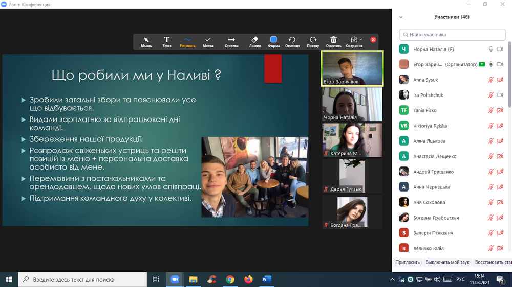 А. Зарічнюк на прикладі очолюваного ним бару-сидерії «Білий налив» розповів про те, якою є діяльність закладів ресторанного господарства в умовах карантинних обмежень, зокрема, з якими обмеженнями їм доводиться стикатися, які заходи реалізовувати у боротьбі за споживчий попит, яким чином вибудовувати співпрацю з постачальниками продукції тощо.