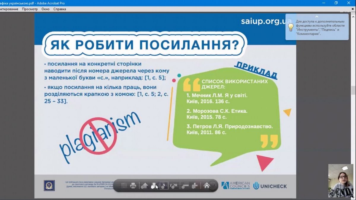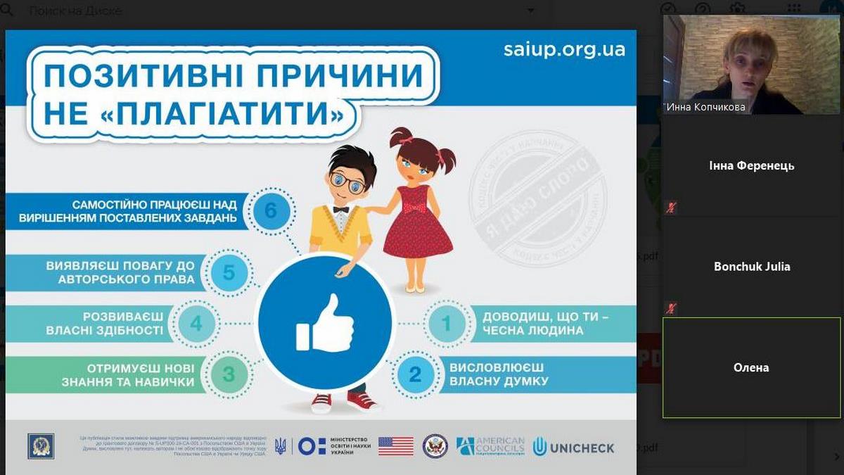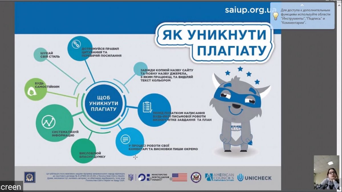 Для підготовки та проведення заходів були використані освітні ресурси сайту https://academiq.org.ua/ та матеріали, які напрацьовані в рамках Проєкту сприяння академічній доброчесності в Україні (Strengthening Academic Integrity in Ukraine Project – SAIUP), а також онлайн версії програм перевірки академічних текстів на вміст плагіату.