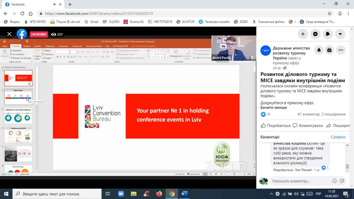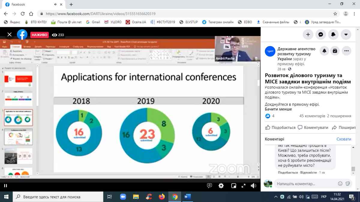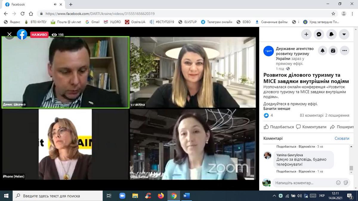 14 квітня 2021 року науково-педагогічні працівники кафедри туризму та готельно-ресторанної справи, здобувачі вищої освіти за спеціальностями «Туризм», «Готельно-ресторанна справа» взяли участь в онлайн-конференції «Розвиток ділового туризму та МІСЕ завдяки внутрішнім подіям», організованій Державним агентством розвитку туризму України у межах реалізації Всеукраїнського проєкту «Tourism ReView».