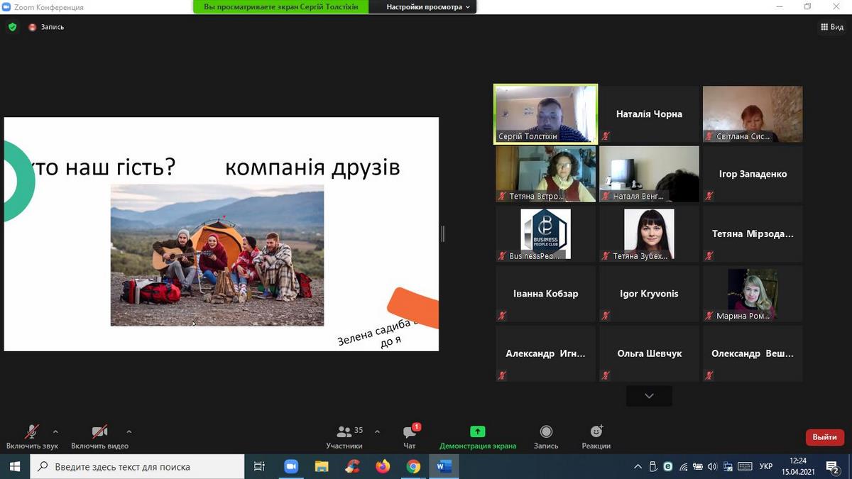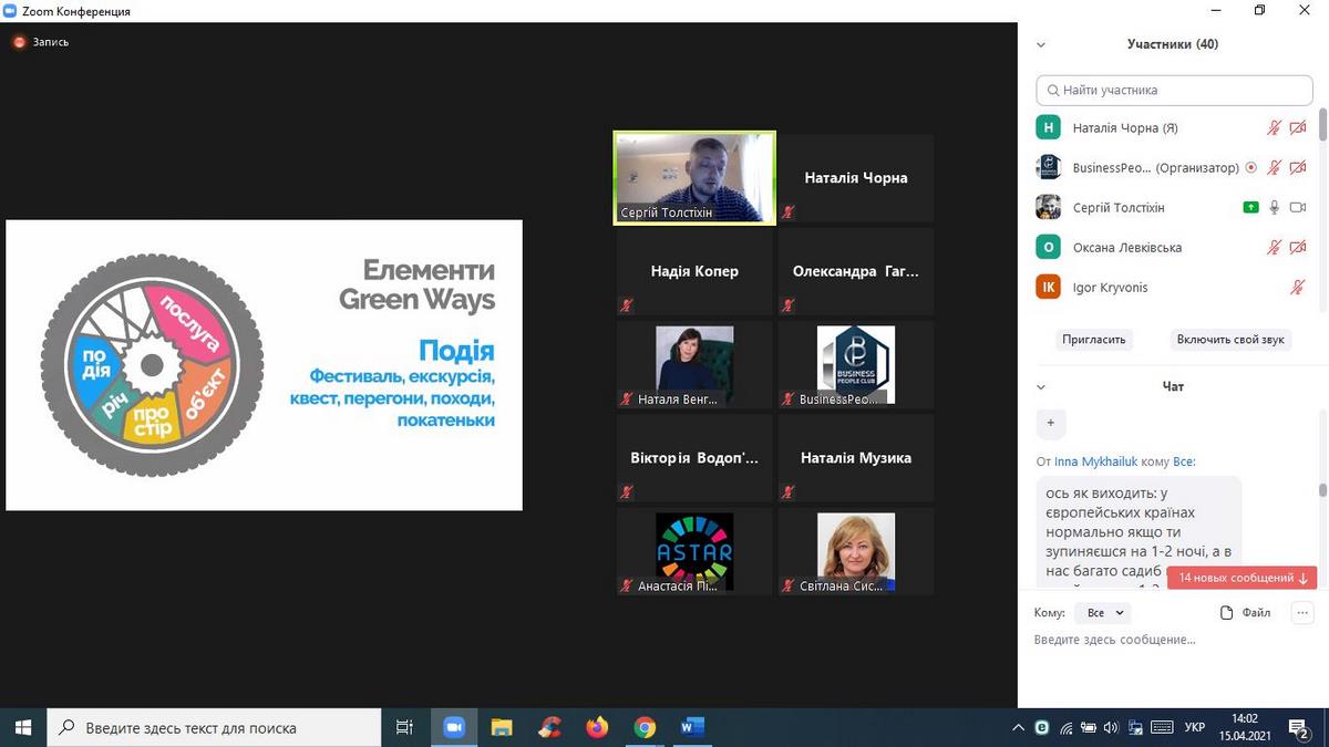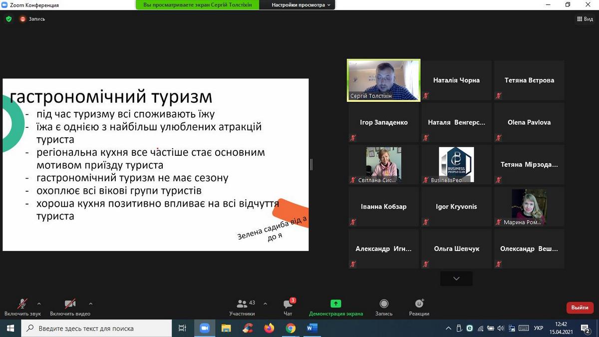 15 квітня 2021 року науково-педагогічні працівники кафедри туризму та готельно-ресторанної справи взяли участь в онлайн-вебінарі «Туризм в умовах Пандемії», організованому ГО «Business People Club». Доповідачем на заході виступив Сергій Толстіхін - експерт з розвитку туризму в громадах, веломандрівник, який відвідав 31 країну на велосипеді, креатор проєкту Green Ways - Зелені стежки України, координатор Спілки сприяння розвитку сільського зеленого туризму в Хмельницькій області, власник садиби "Дім мандрівника", проєктний менеджер Агенції сталого розвитку "Астар", комунікаційний координатор Всеукраїнської ініціативи "Активна Громада".