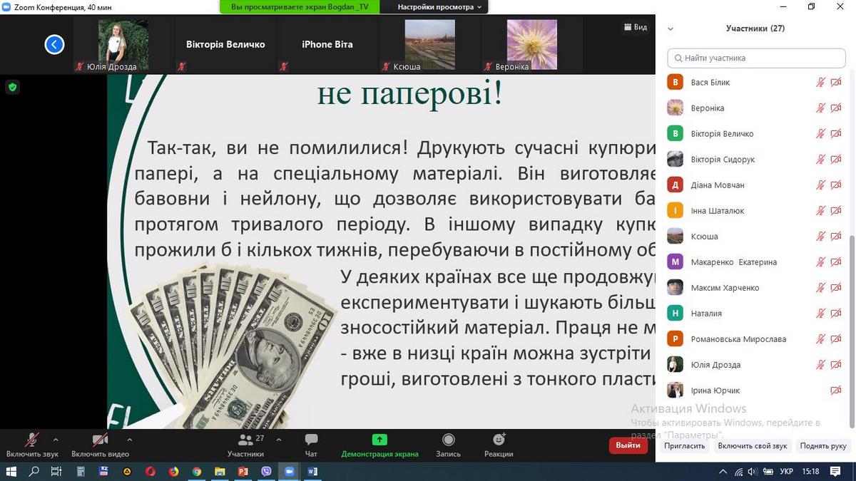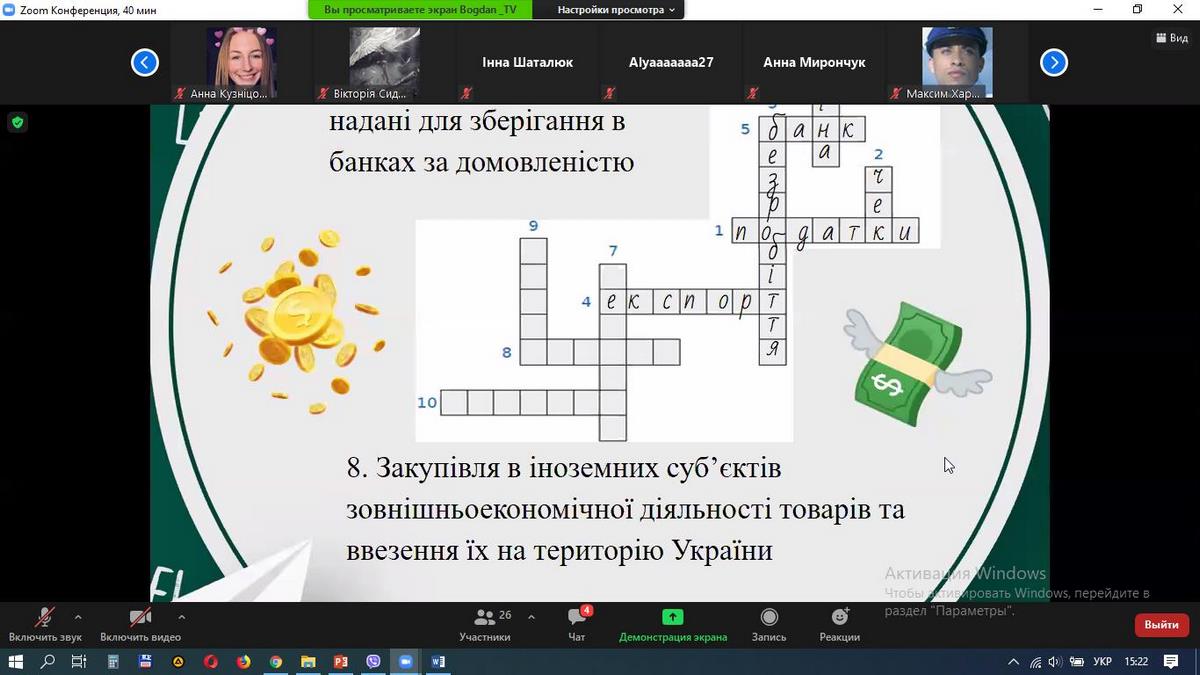 Захід проводився на платформі Zoom, до нього долучилися майбутні абітурієнти та активні студенти старших курсів спеціальності 072 «Фінанси, банківська справа та страхування». Учасники дізналися багато цікавої інформації про гроші в ігровій формі, залучилися до вирішення кросвордів і ребусів. Онлайн-тренінг дозволив майбутнім абітурієнтам дізнатися про особливості навчання за спеціальністю 072 «Фінанси, банківська справа та страхування».