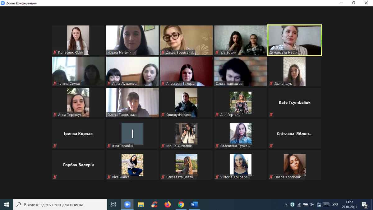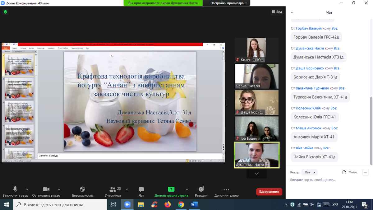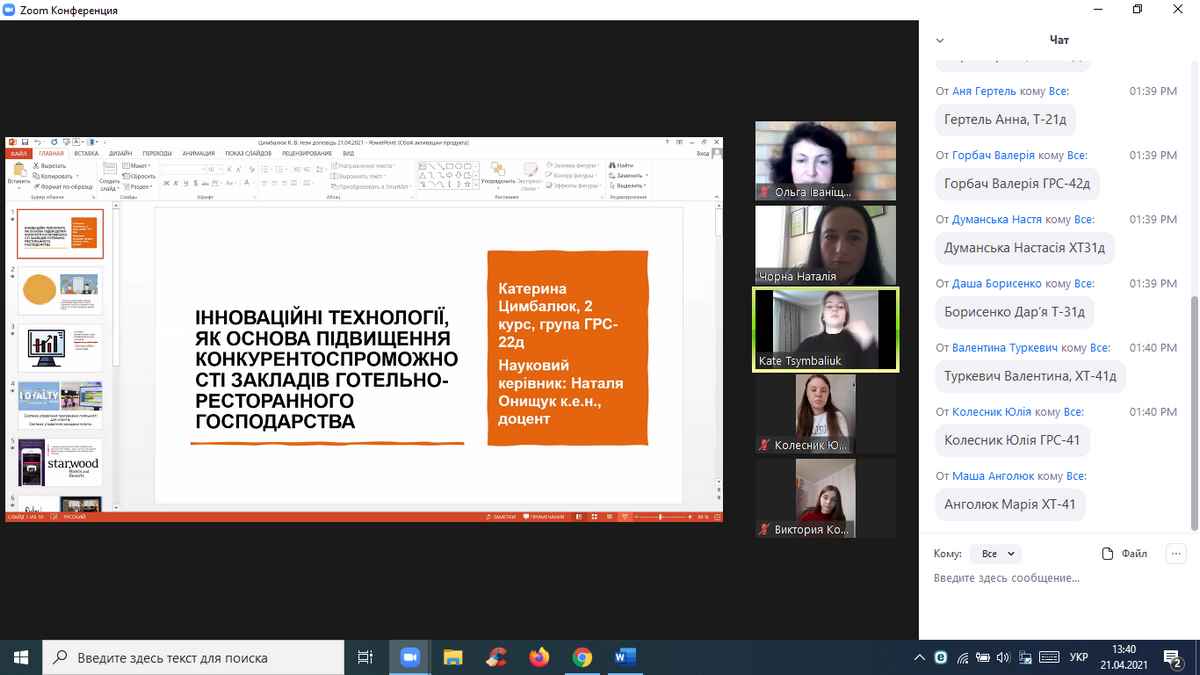 З науковими доповідями на актуальну тематику виступили Борисенко Д. (гр. Т-31д), Гертель А. (гр. Т-21д), Анголюк М. (гр. ХТ-41д), Цимбалюк К. (гр. ГРС-22д), Думанська Н. (гр. ХТ-31д), Чайка В. (гр. ХТ-41д). Виступи доповідачів прозвучали на актуальні та цікаві теми, свідченням чого стало жваве їх обговорення всіма учасниками зустрічі. Доповідачі були нагороджені подяками. Головувала на засіданні завідувач кафедри туризму та готельно-ресторанної справи, д.і.н., професор Чорна Н., секретар засідання – здобувач вищої освіти за спеціальністю 181 «Харчові технології» ОС «магістр», член студентського наукового товариства «ВАТРА» Таранюк І. Участь у засіданні взяли 25 осіб.