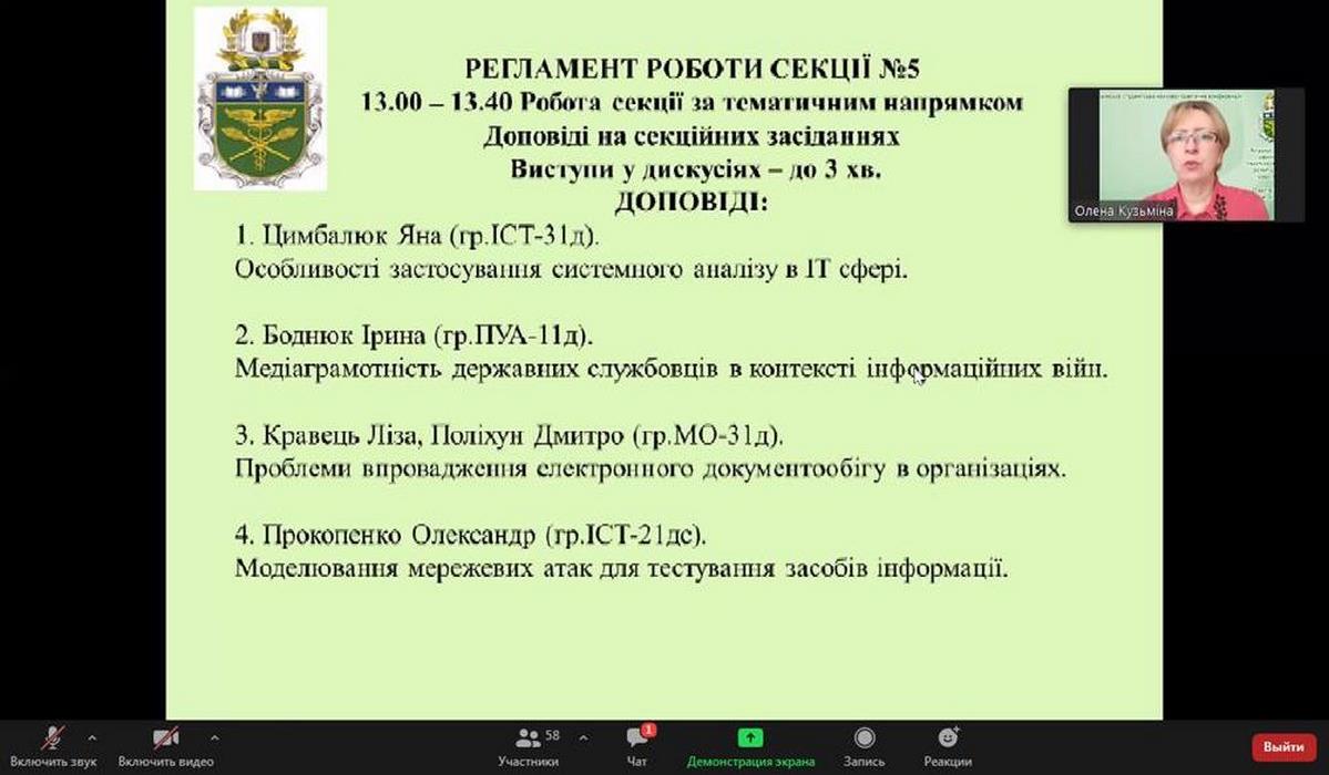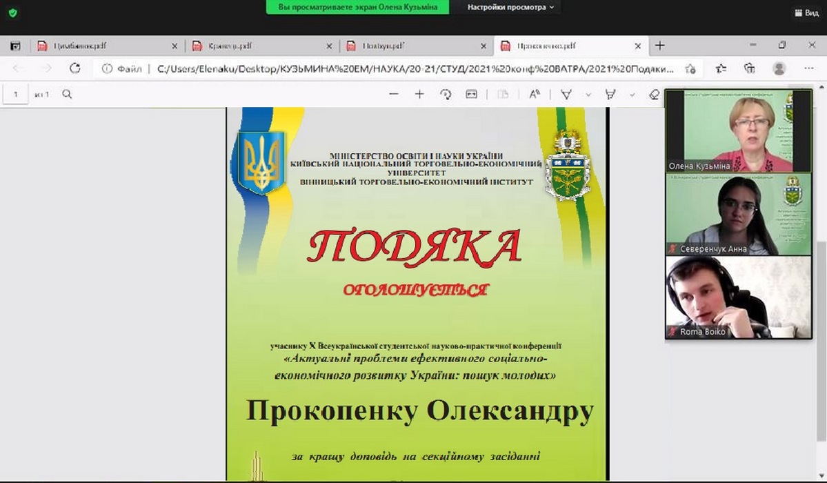 21 квітня 2021 року в рамках Х Всеукраїнської студентської науково-практичної конференції «Актуальні проблеми ефективного соціально-економічного розвитку України: пошук молодих» у Вінницькому торговельно-економічному інституті КНТЕУ відбулося засідання секції №5 «Моделювання та проєктування процесів управління в соціально-економічних системах з використанням інформаційних технологій», керівник секційного засідання – к.т.н., доцент Кузьміна О.М.